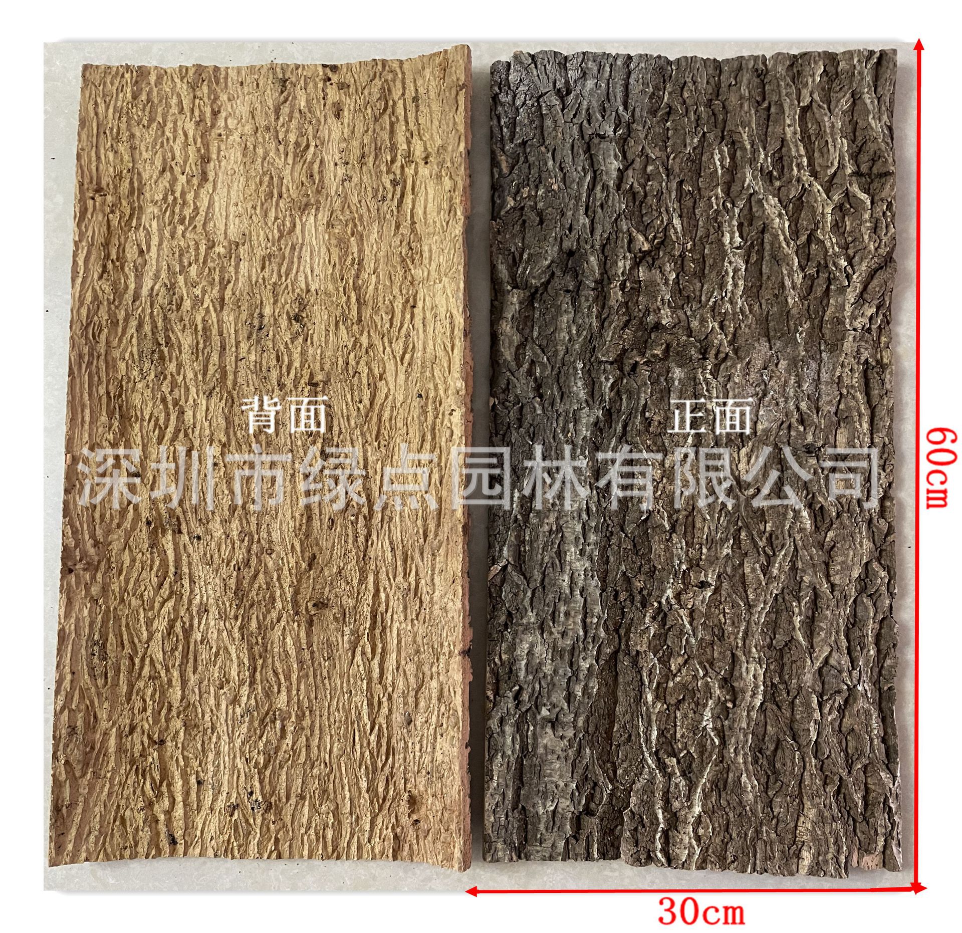 规格:30*60CM,60*90CM,90*120CM等多种尺寸,树皮板厚度在1.5CM左右,尺寸可以定做(定做尺寸50平方起订),因季节不同树皮的现货尺寸均不同,订货时可联系客服咨询。