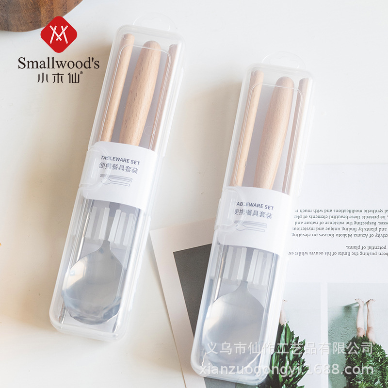 • @小木仙日系便携式盒装木质勺子筷子天然环保雕刻餐具筷勺套装ins