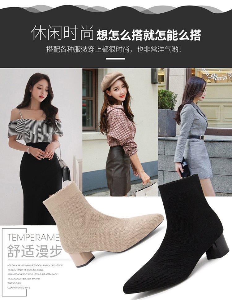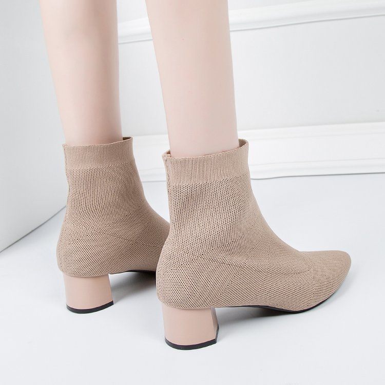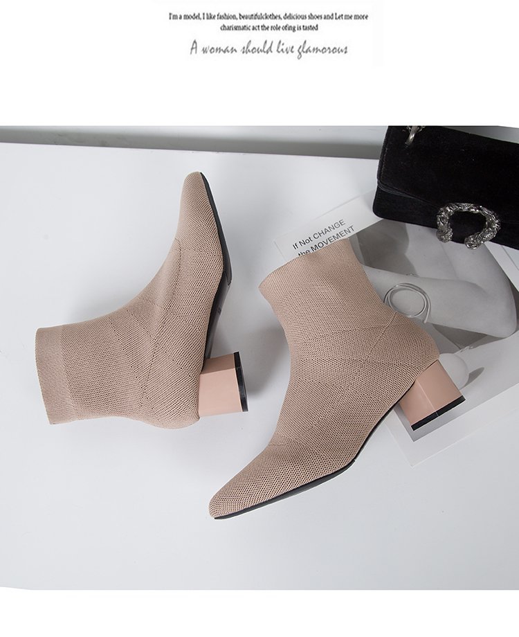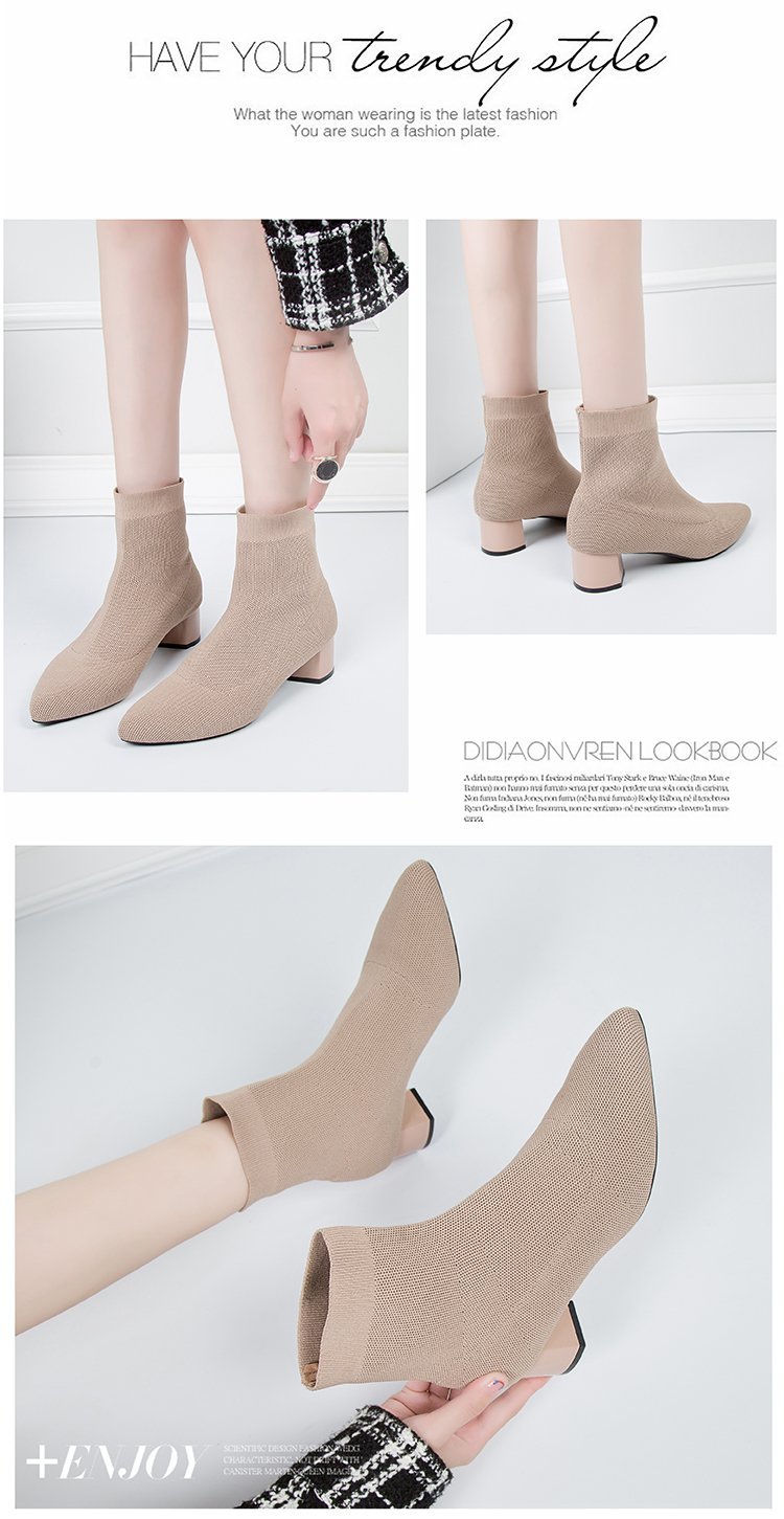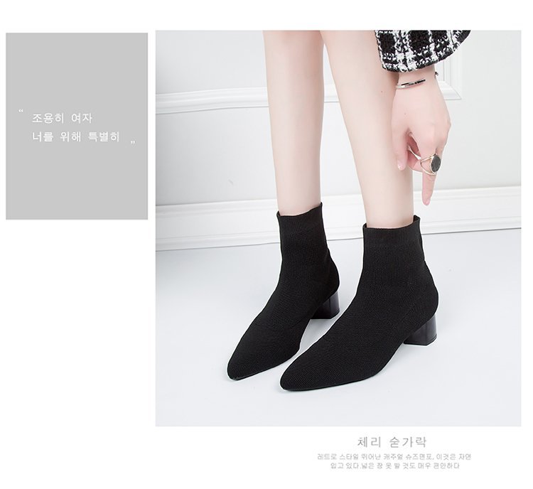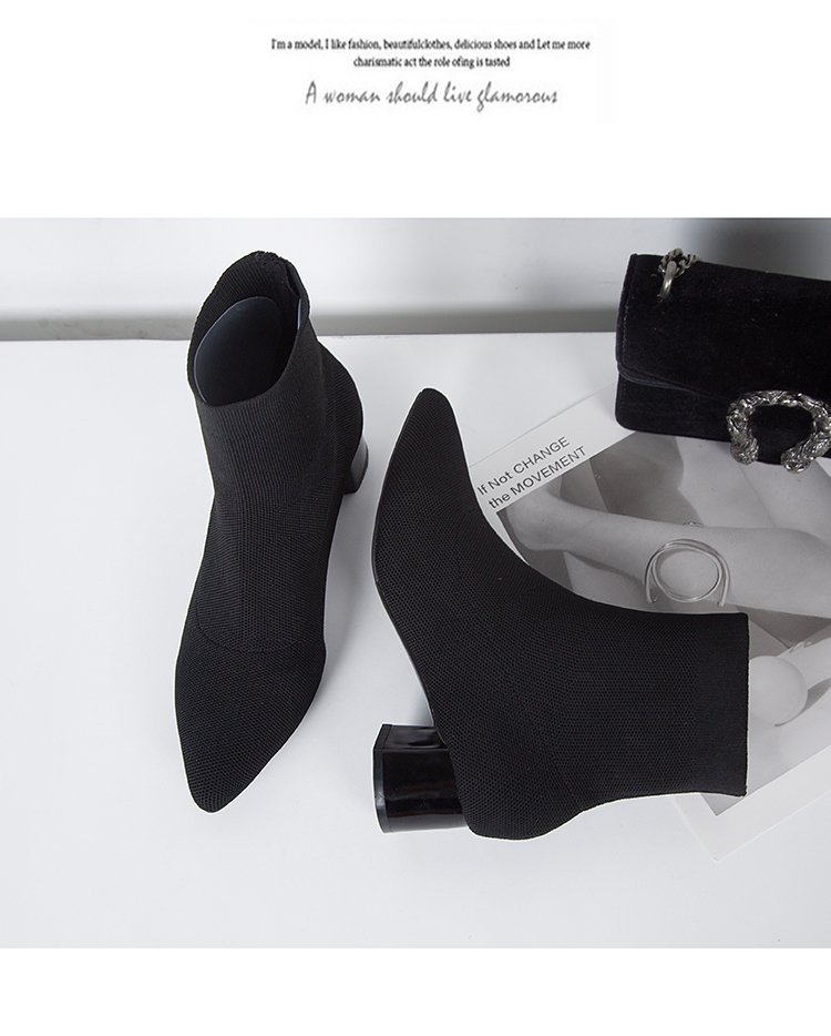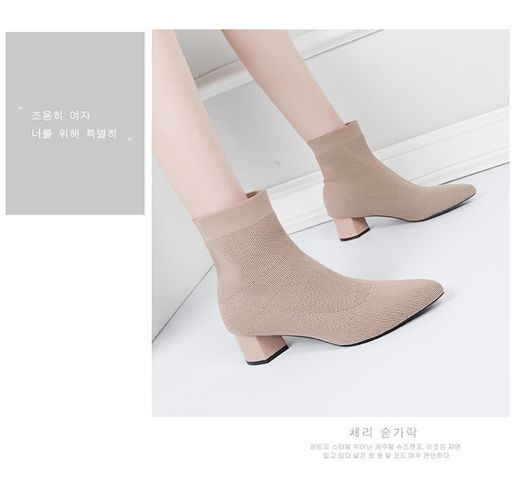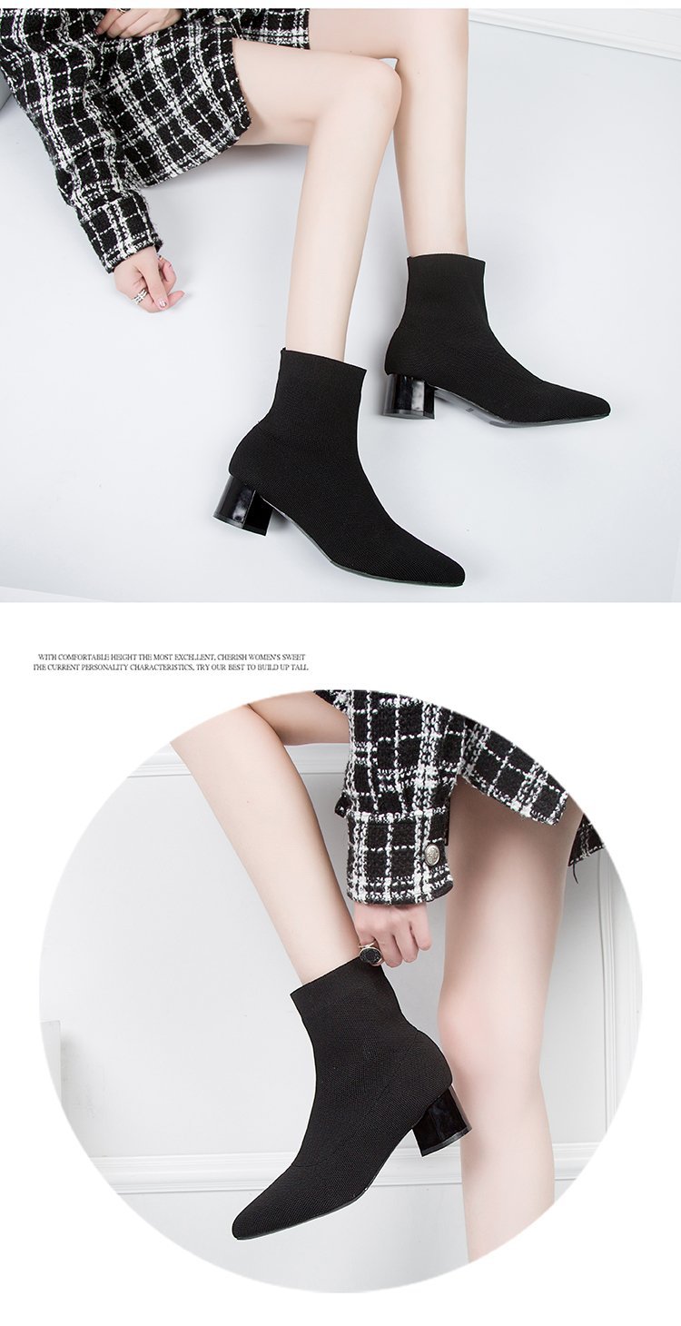 2025 가을 겨울 신상 여성용 포인티드 토 미드카프 부츠, 두꺼운 굽의 니트 유럽 및 미국 패션 신축성 부츠, 편안한 캐주얼 양말 부츠