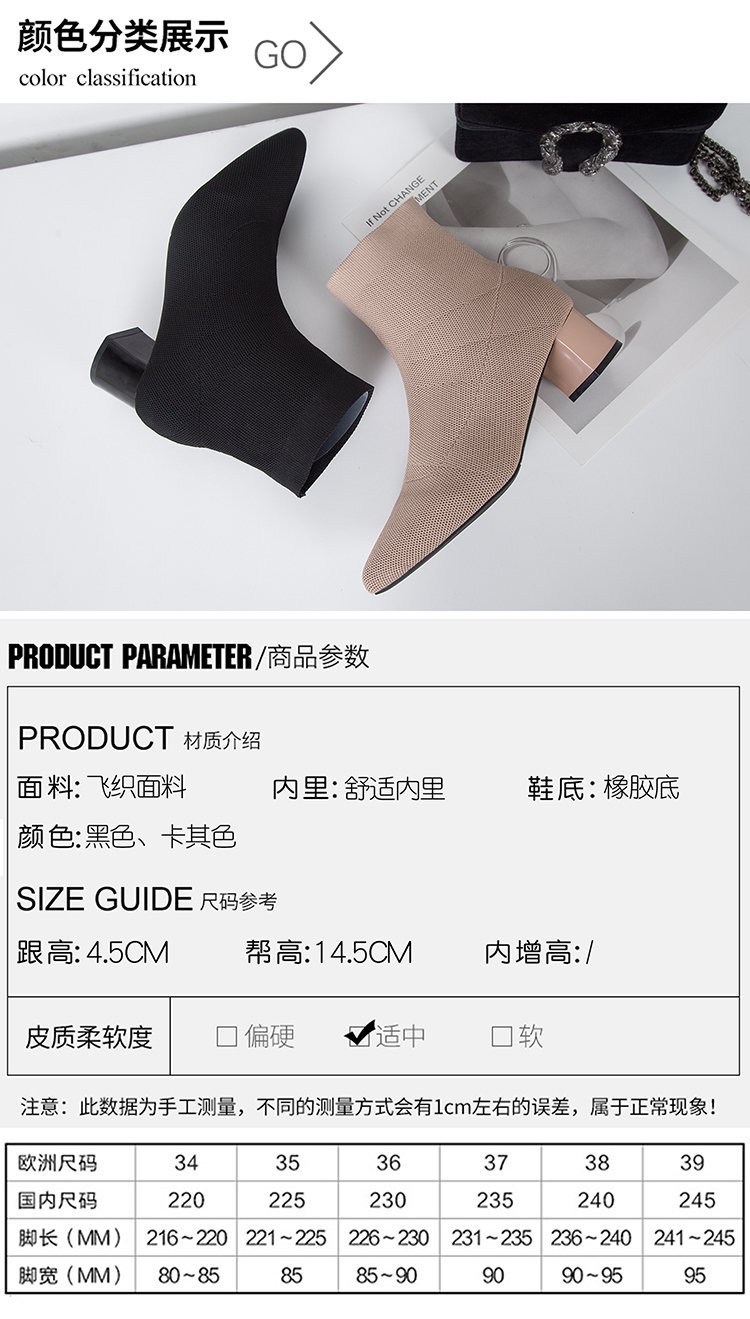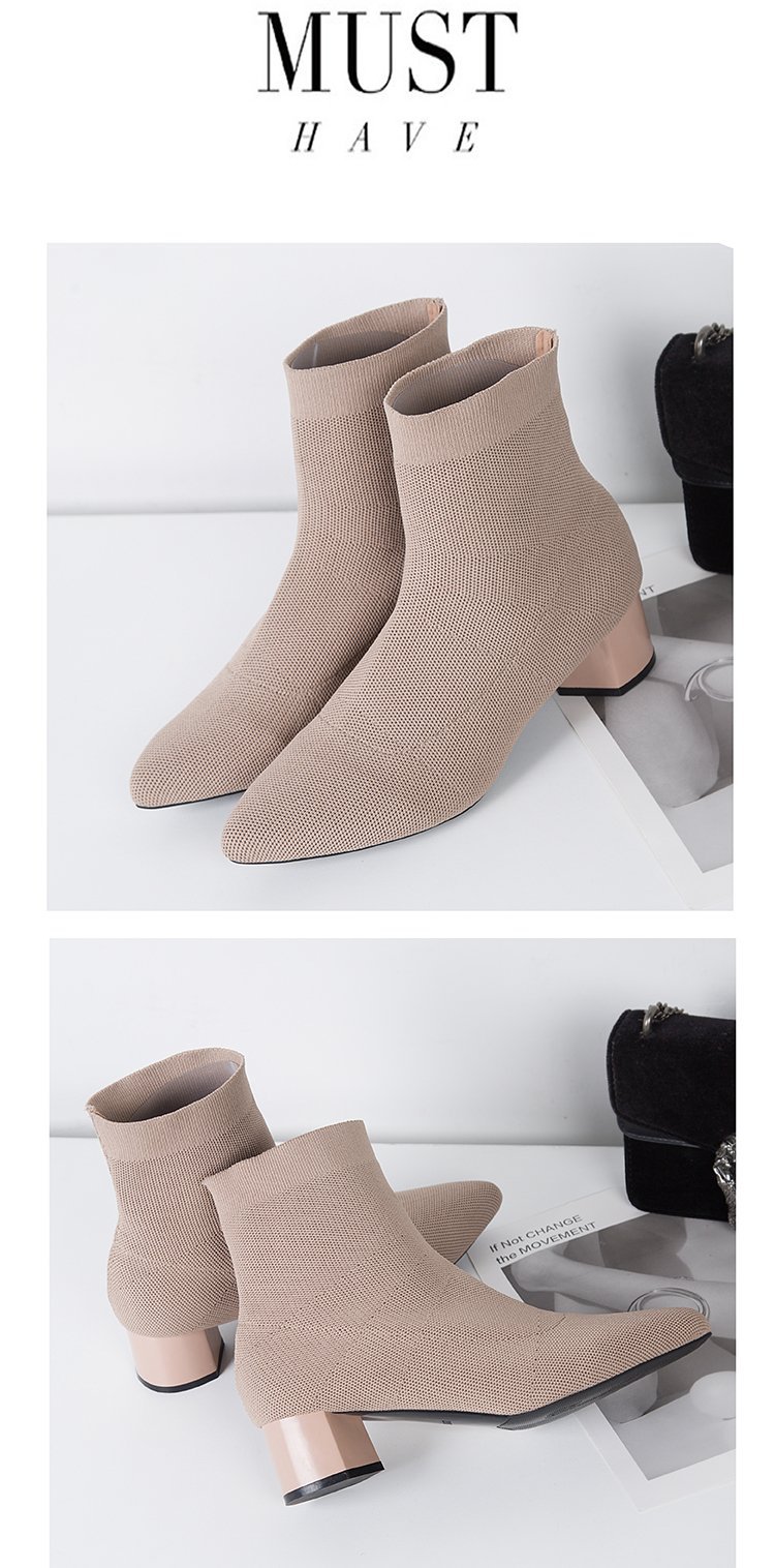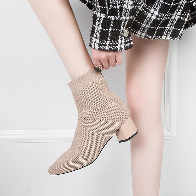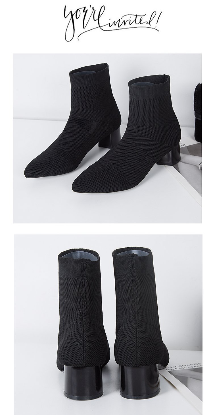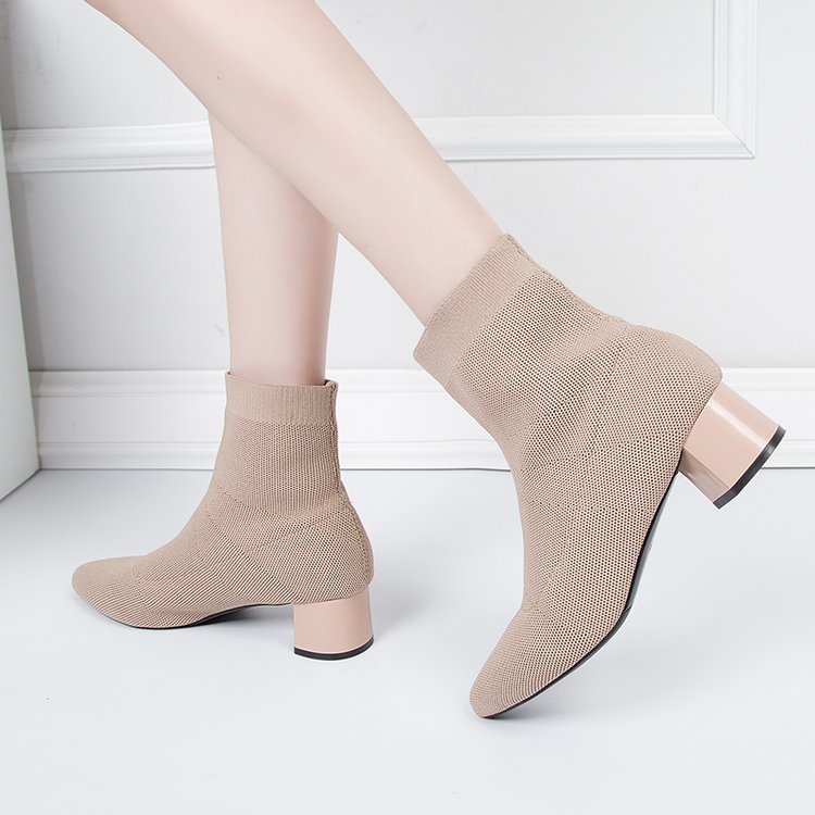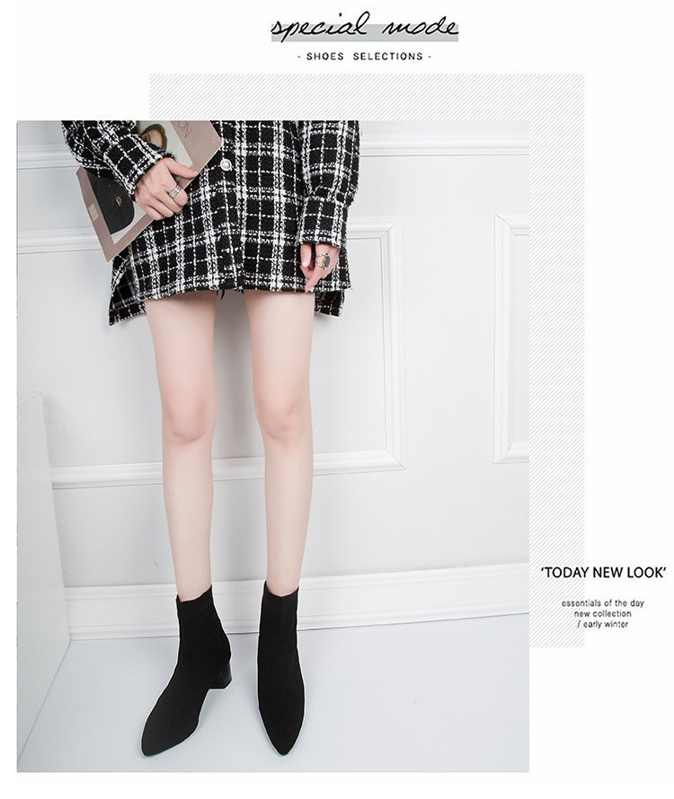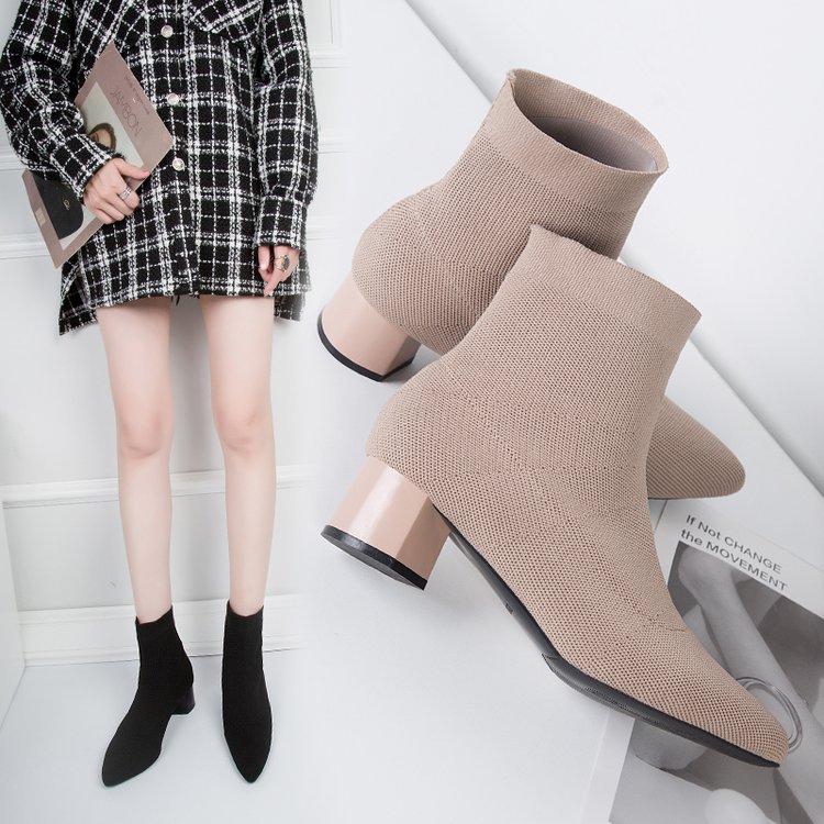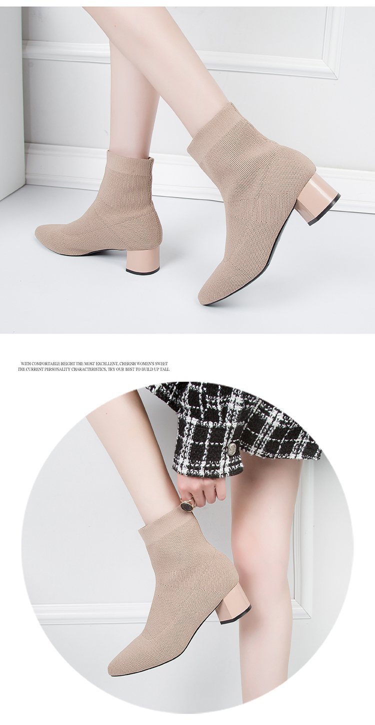 2025 가을 겨울 신상 여성용 포인티드 토 미드카프 부츠, 두꺼운 굽의 니트 유럽 및 미국 패션 신축성 부츠, 편안한 캐주얼 양말 부츠