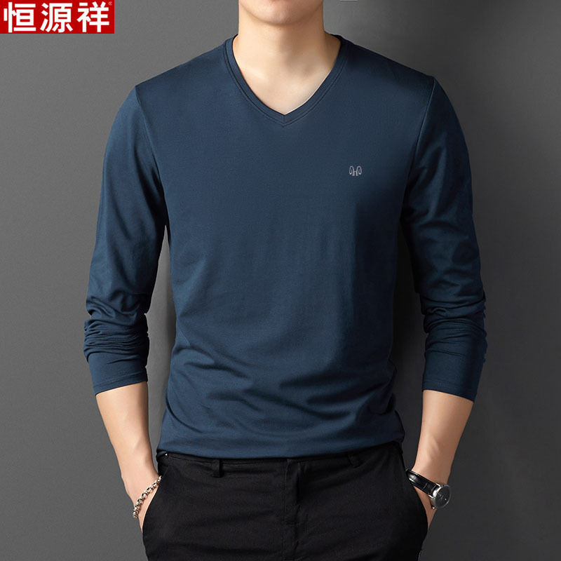 Hengyuanxiang 긴팔 티셔츠 남성용 V넥 티셔츠 겨울 순면 중년 남성 아빠 탑 가을 베이스 셔츠
