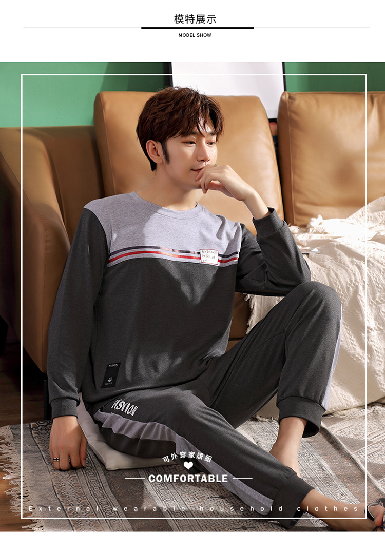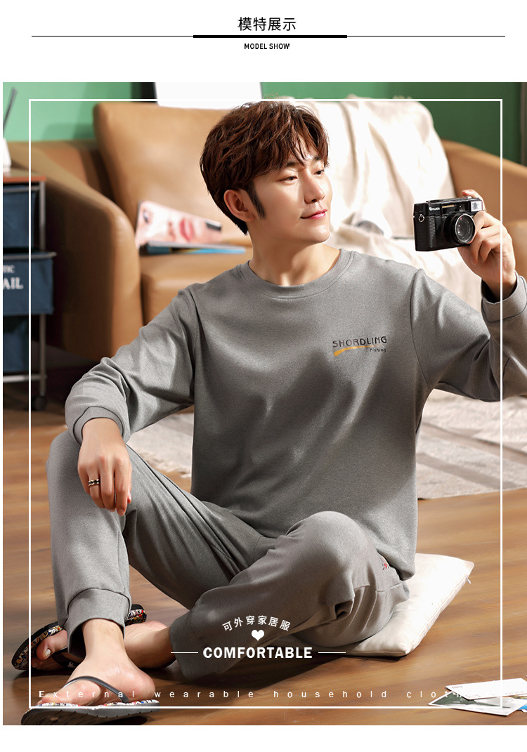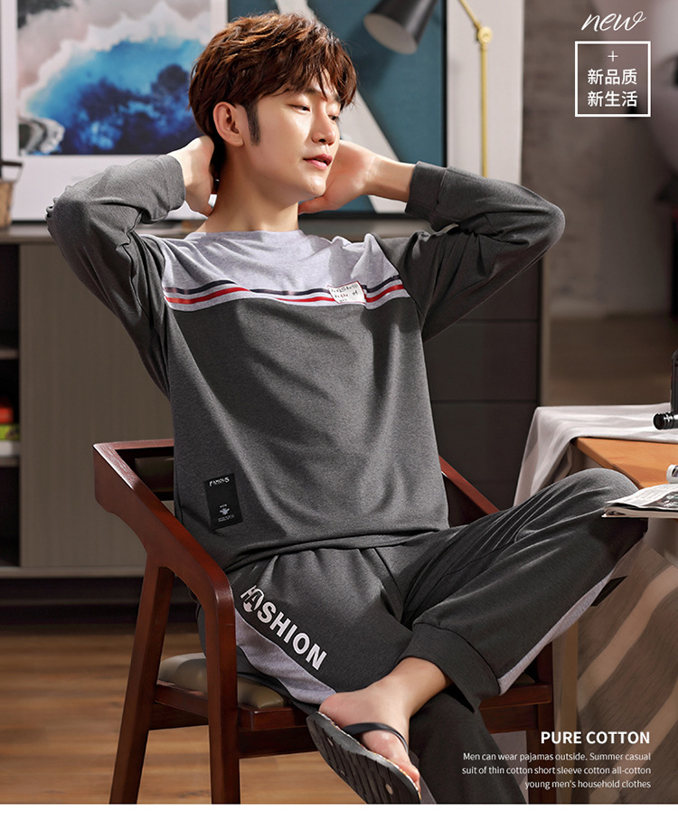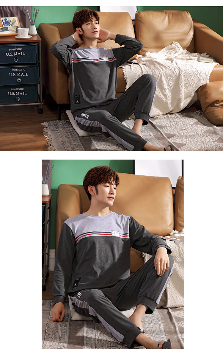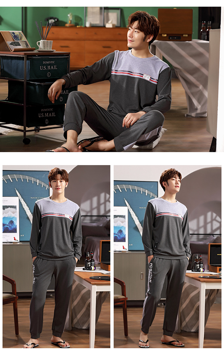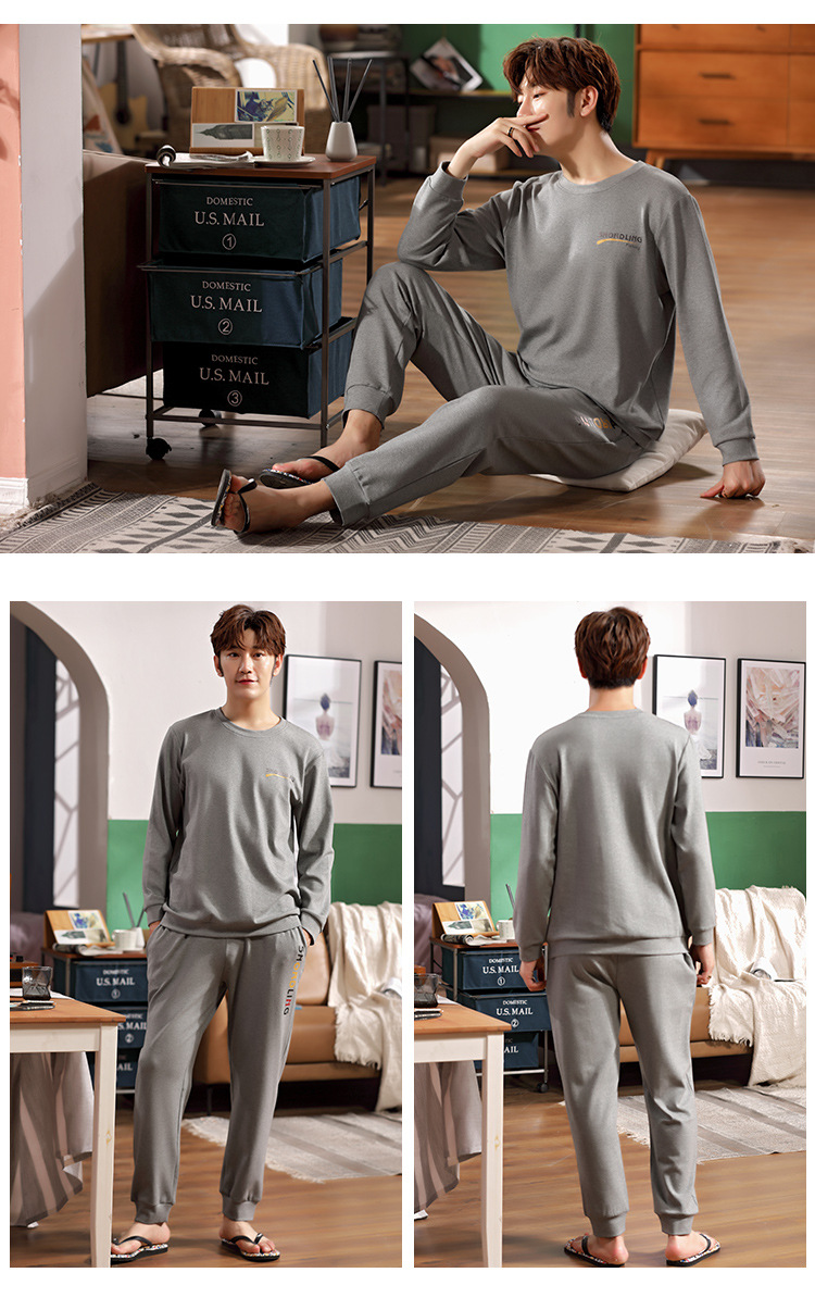 남자의 순면 잠옷 봄과 가을 한국 스타일 유행 간단한 라운드 넥 풀오버 플러스 사이즈 귀여운 가정 의류 남자의 세트스토어 가기