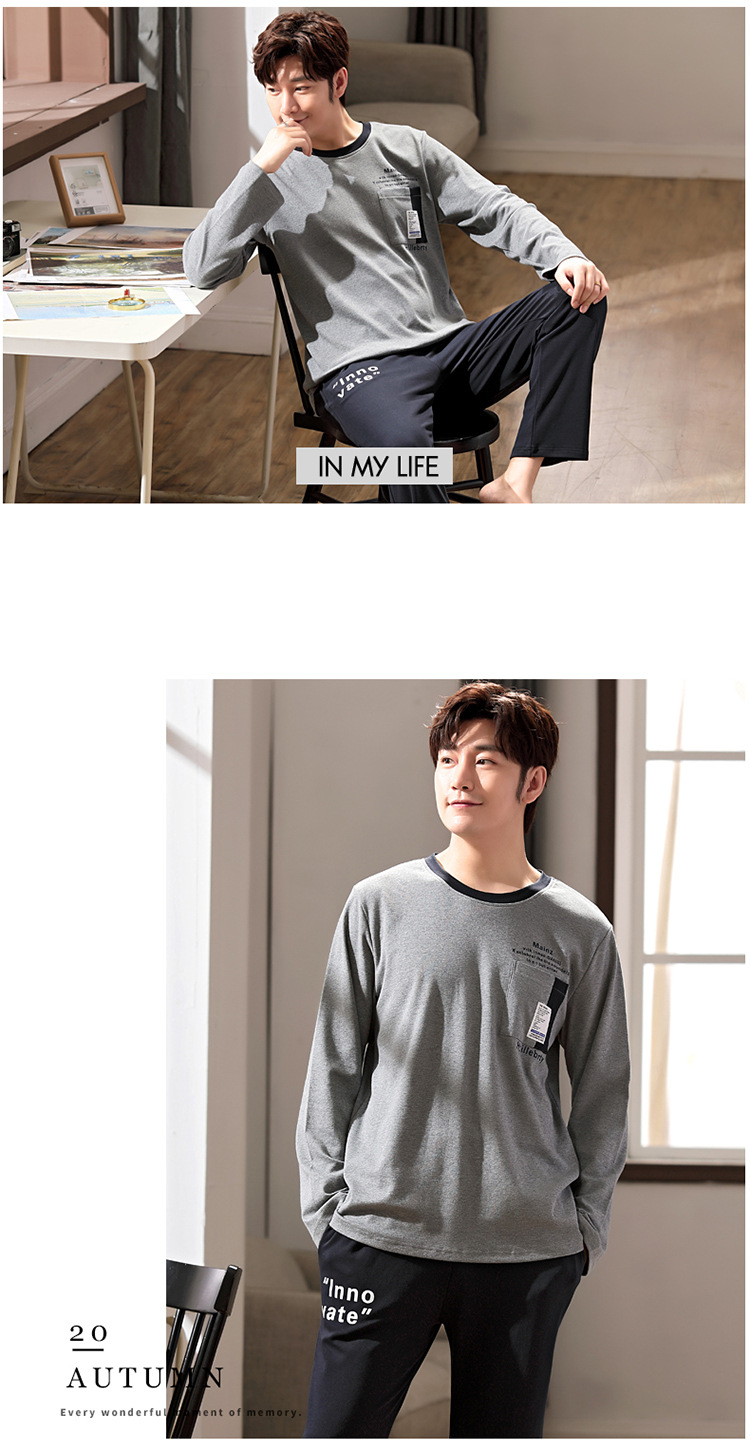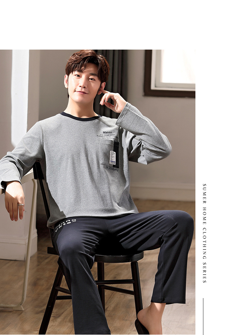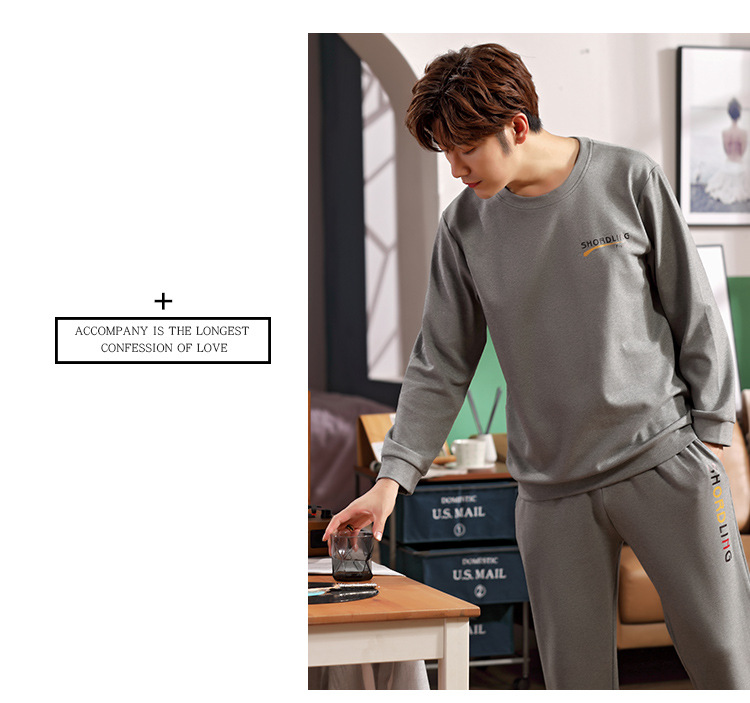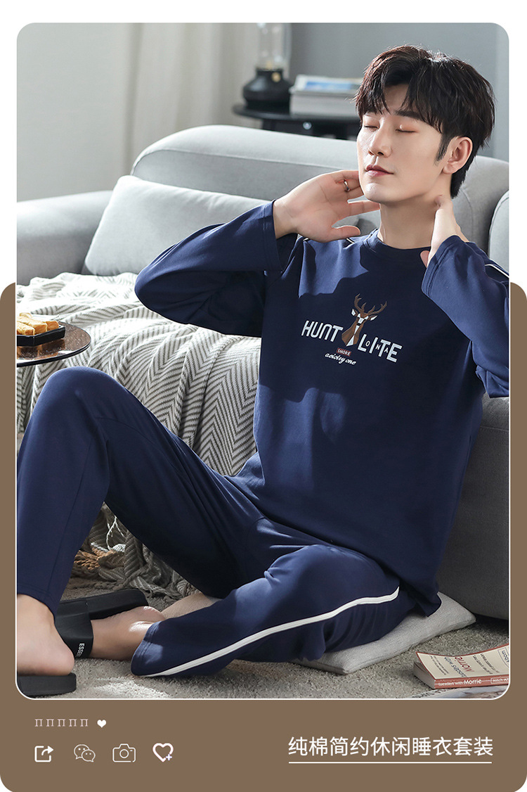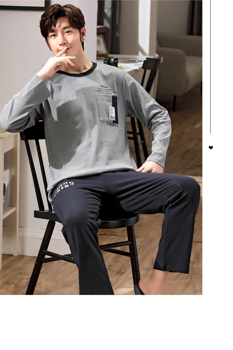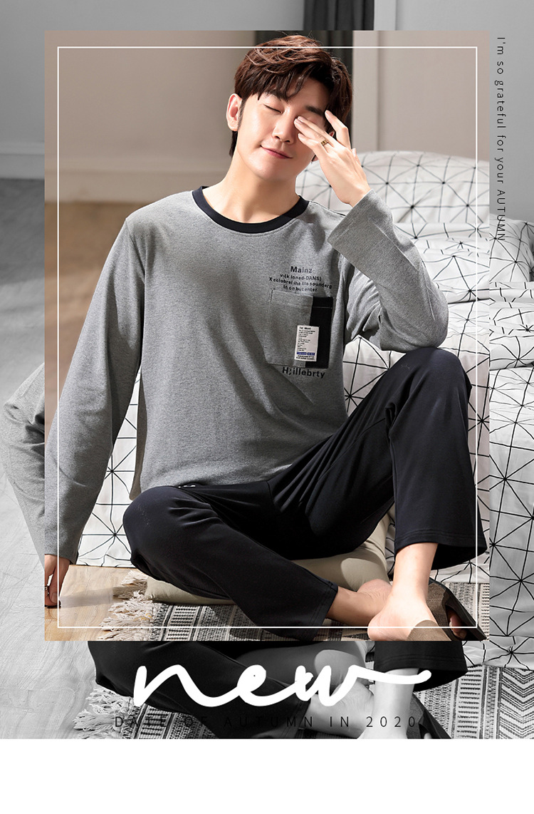 남자의 순면 잠옷 봄과 가을 한국 스타일 유행 간단한 라운드 넥 풀오버 플러스 사이즈 귀여운 가정 의류 남자의 세트스토어 가기