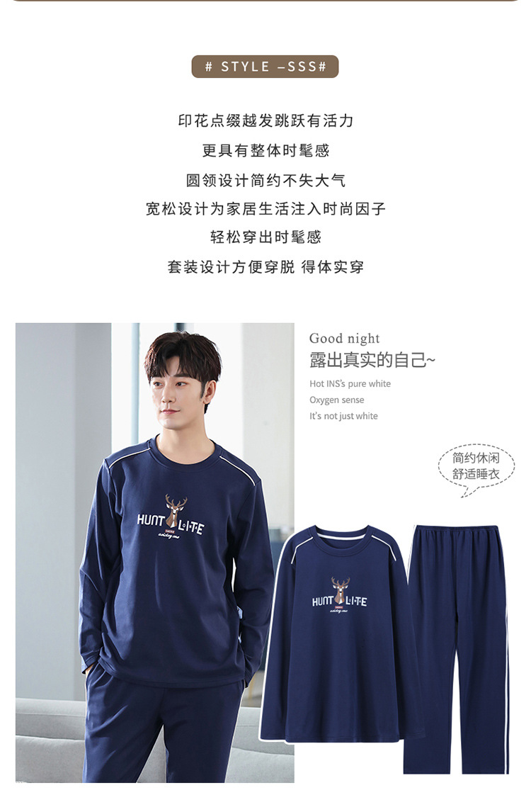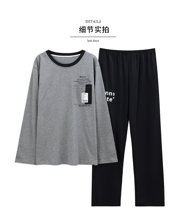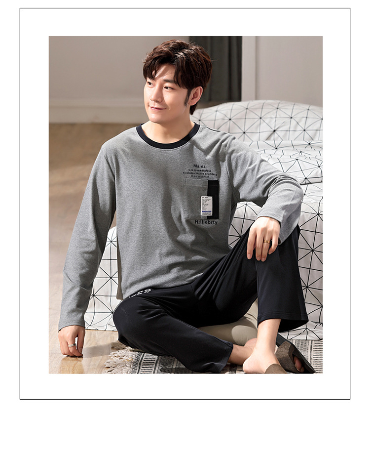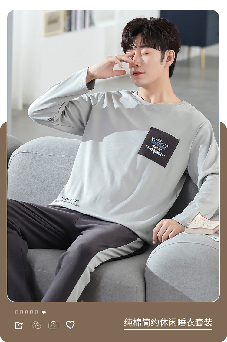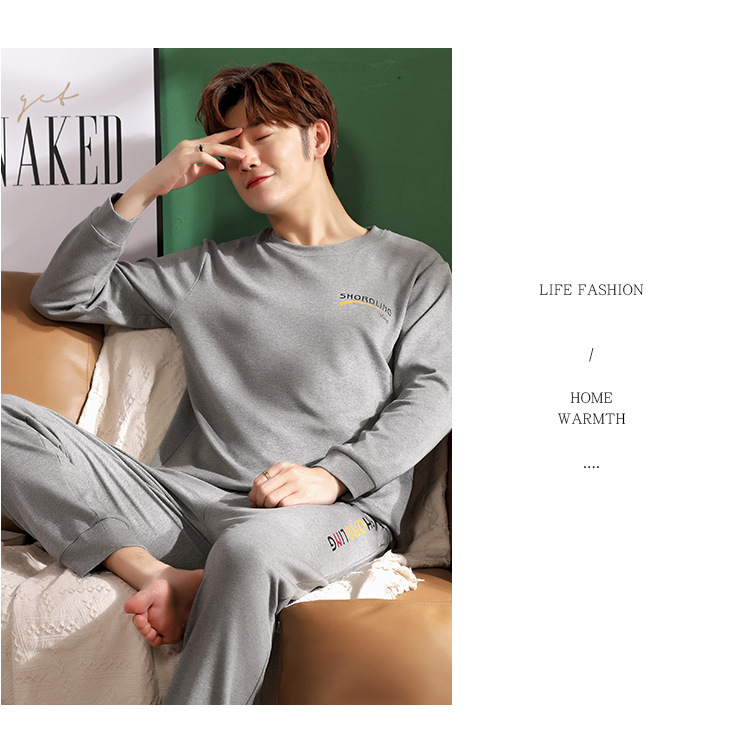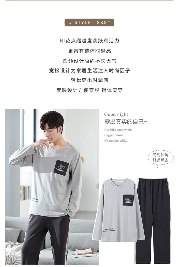 남자의 순면 잠옷 봄과 가을 한국 스타일 유행 간단한 라운드 넥 풀오버 플러스 사이즈 귀여운 가정 의류 남자의 세트스토어 가기