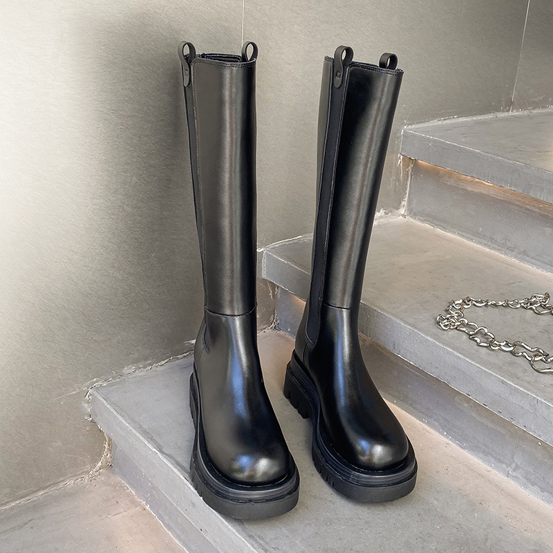 유럽과 미국 부츠 여성 2022 가을과 겨울 새로운 두꺼운 뒤꿈치 두꺼운 바닥 가죽 부츠 여성이지만 무릎 높은 부츠 슬림 나이트 부츠스토어 가기