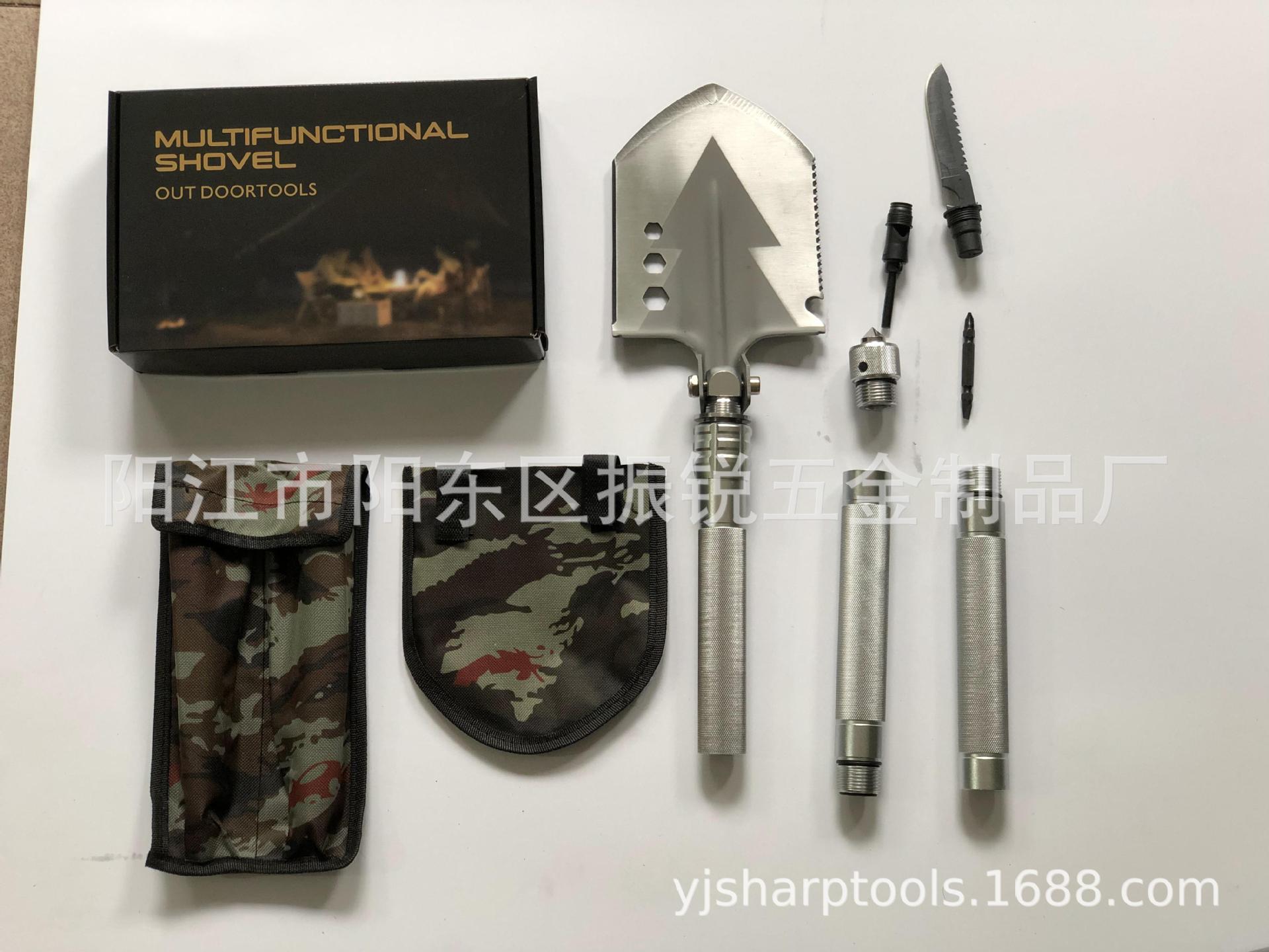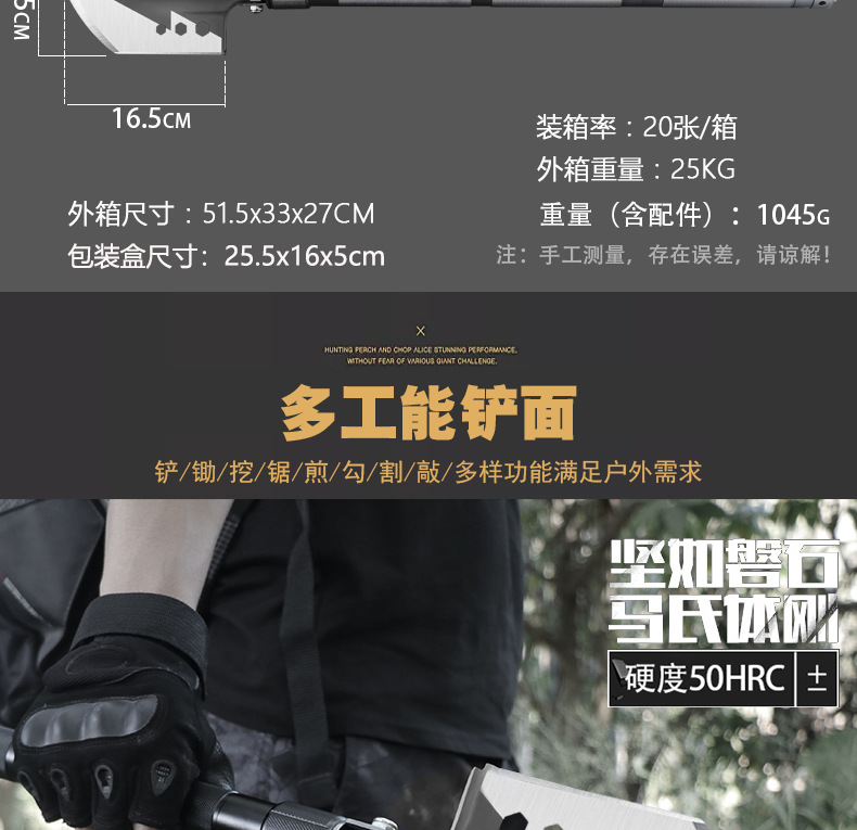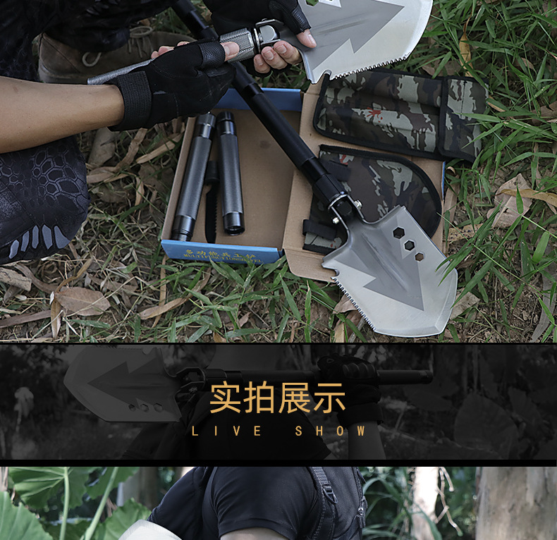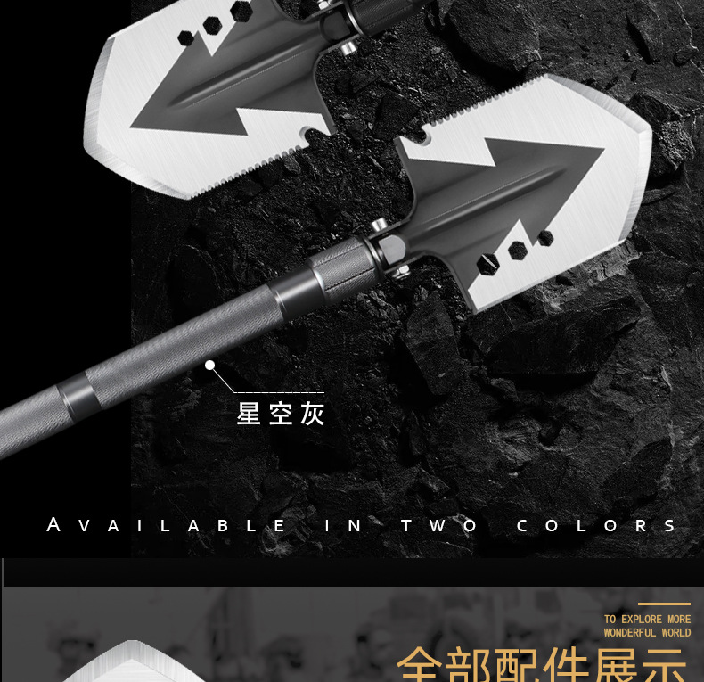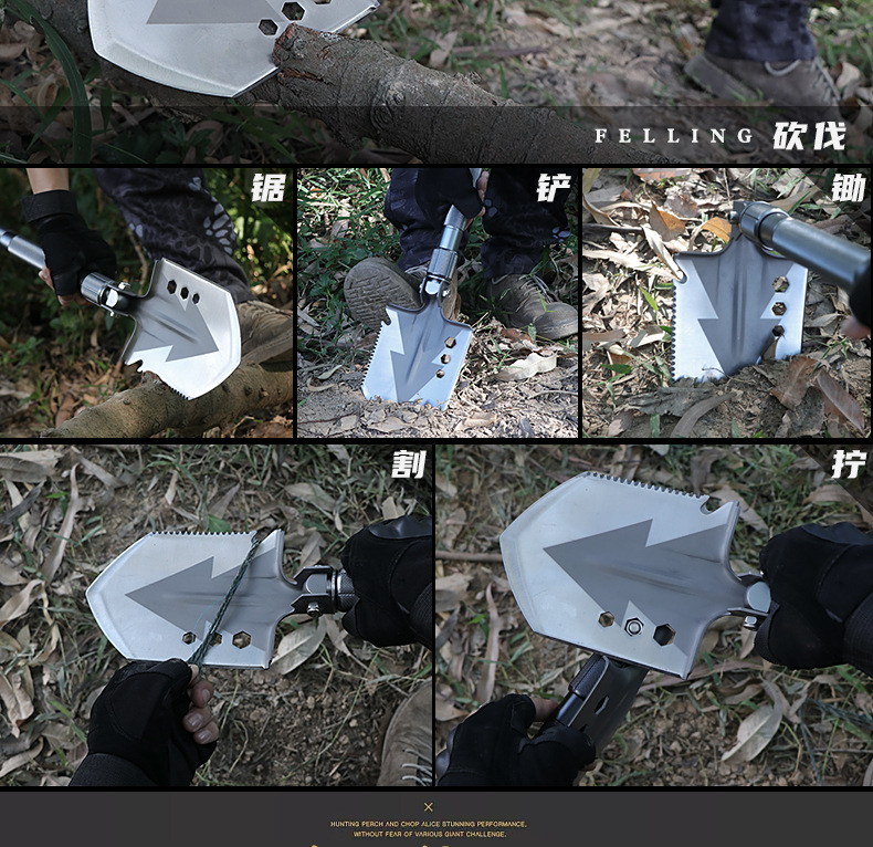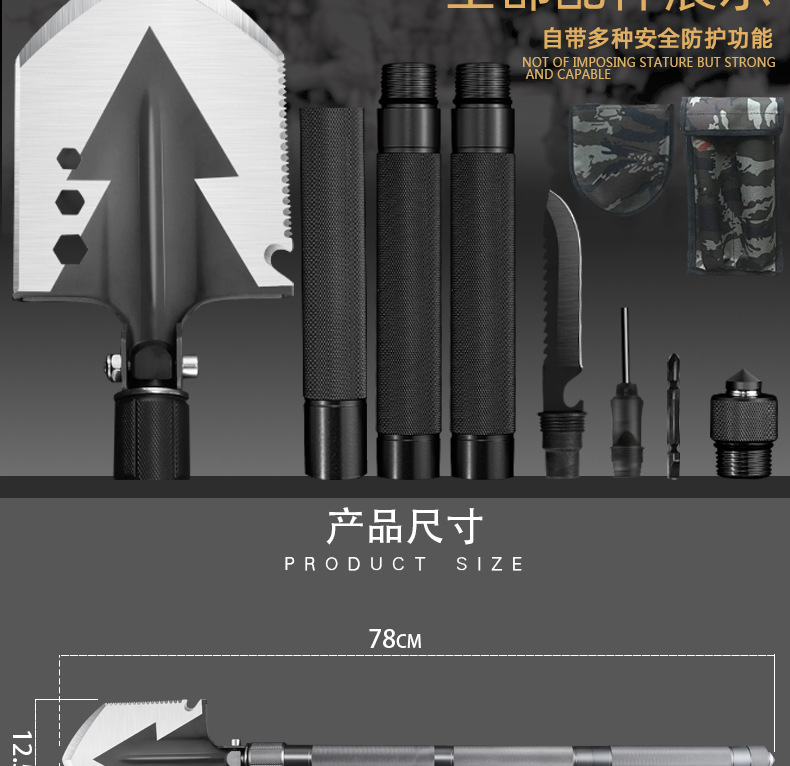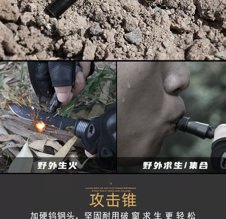 功能介绍:铲 刨 劈 锯 拍 护 破 撬 切 锄 凿 打火 勾 口哨 防身棍 刺 开瓶器 扳手 割绳