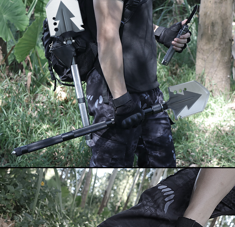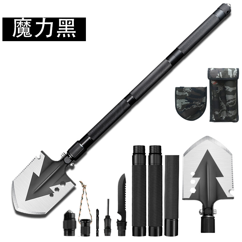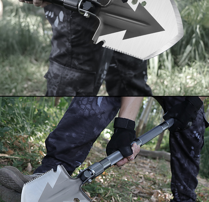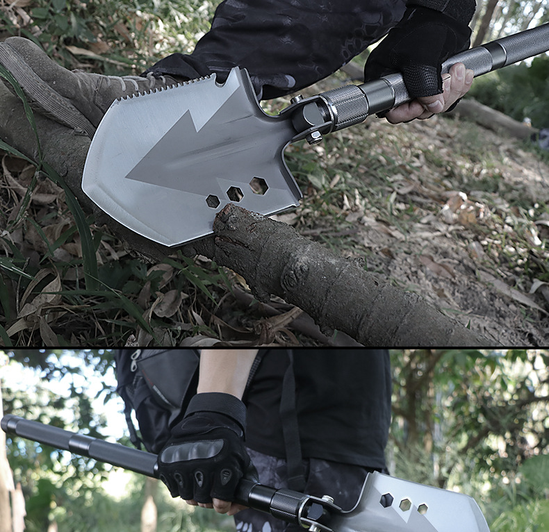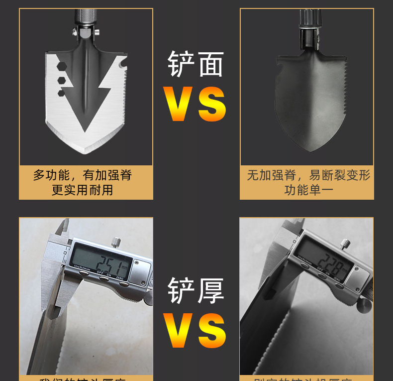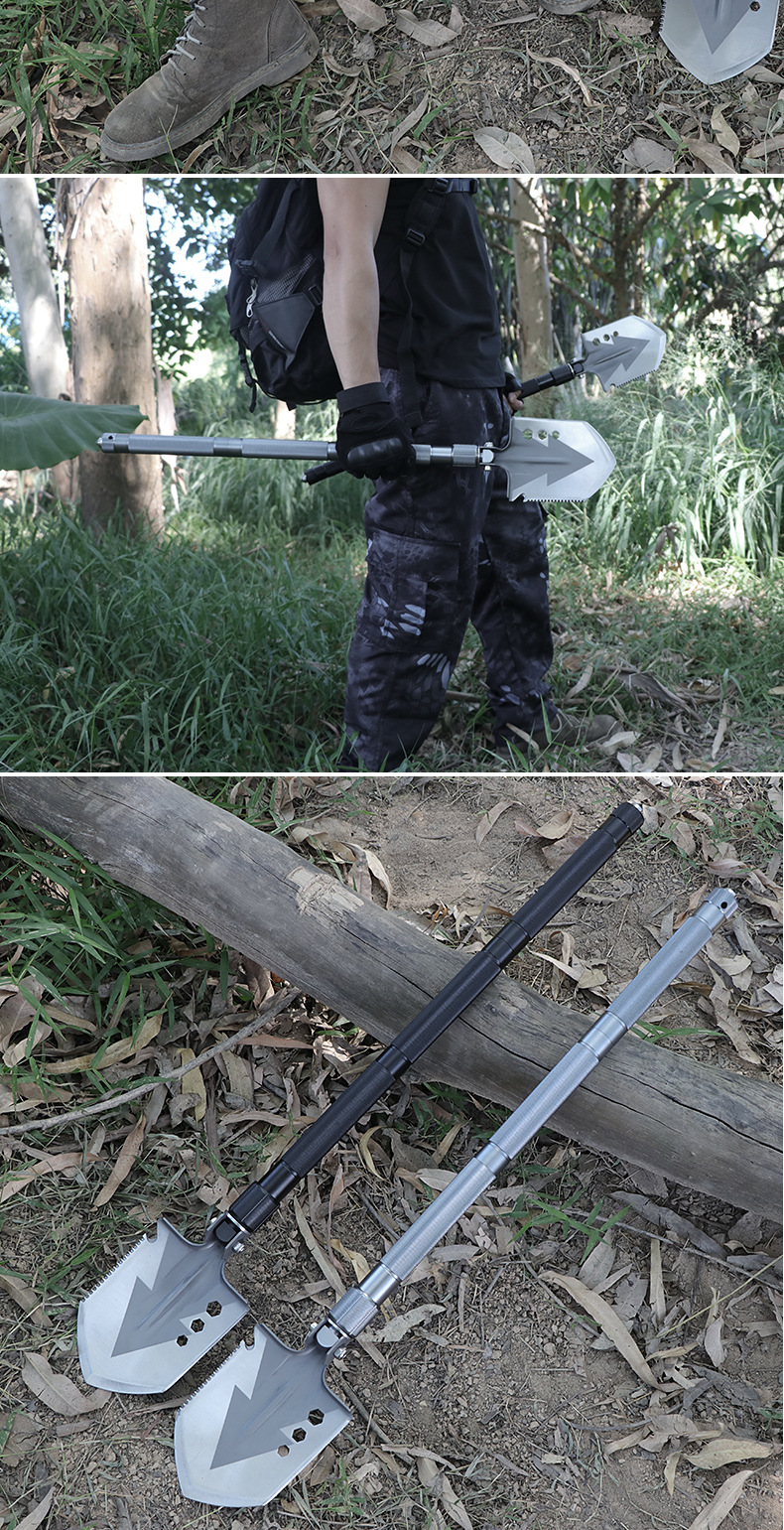 功能介绍:铲 刨 劈 锯 拍 护 破 撬 切 锄 凿 打火 勾 口哨 防身棍 刺 开瓶器 扳手 割绳