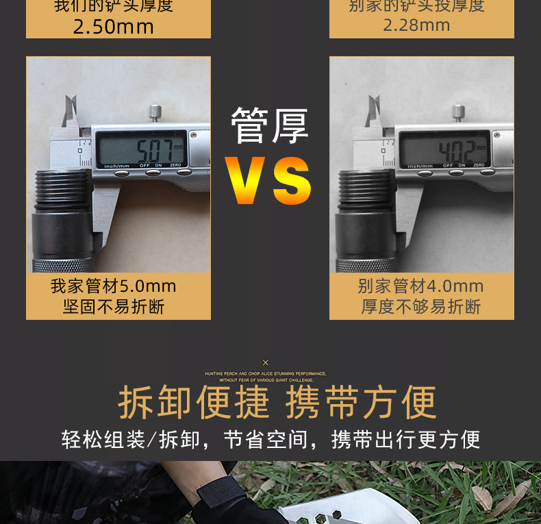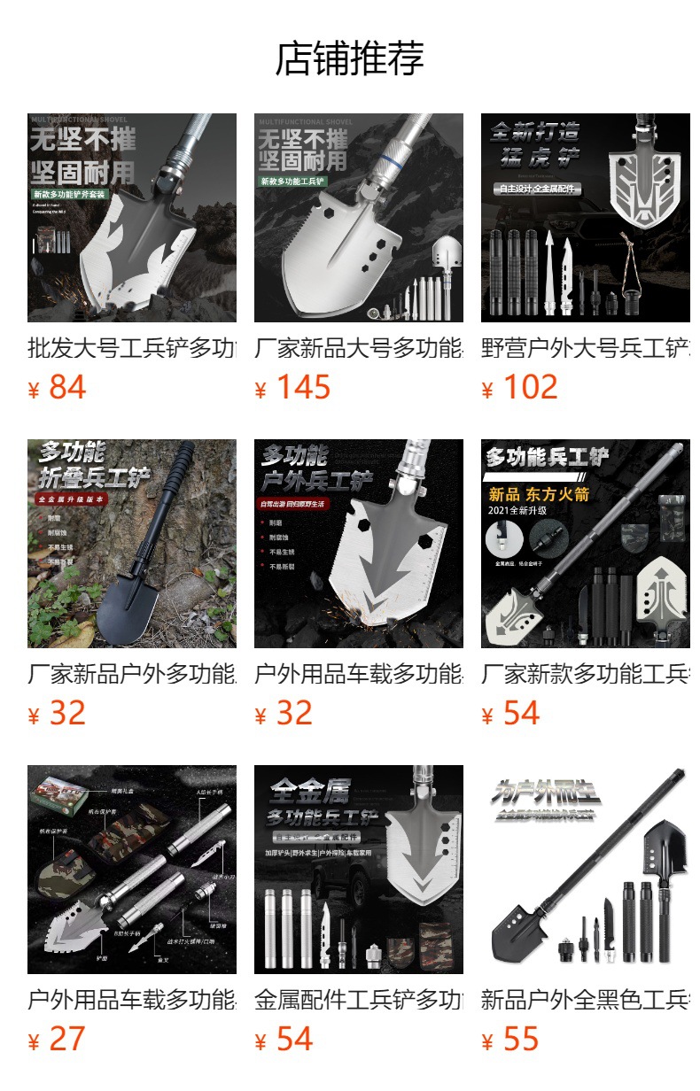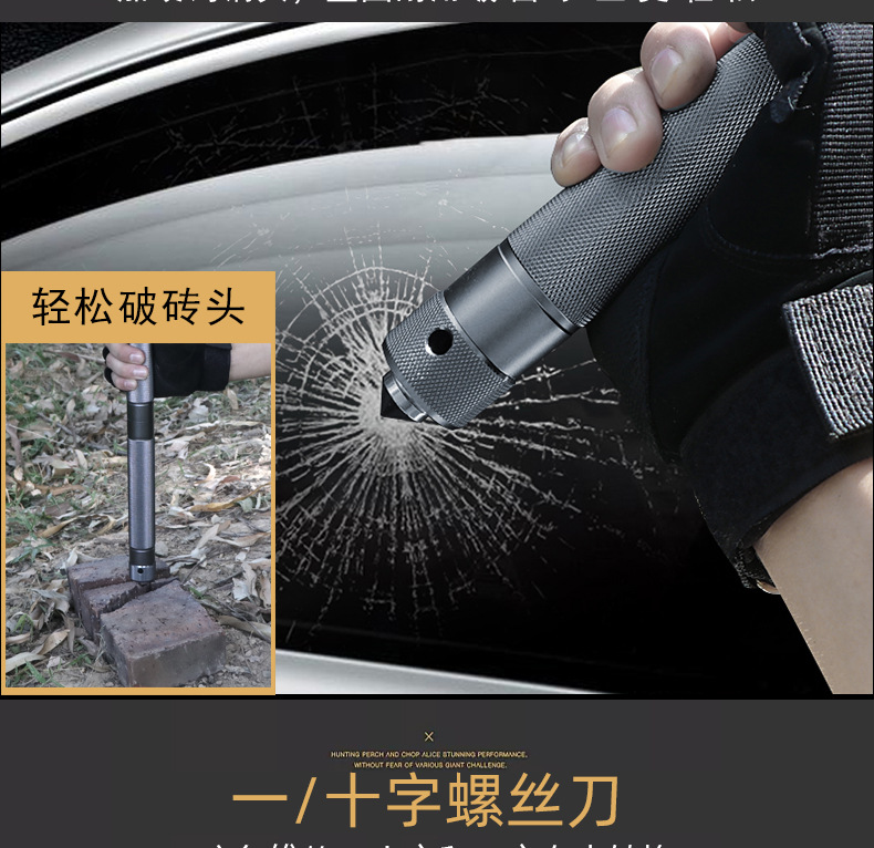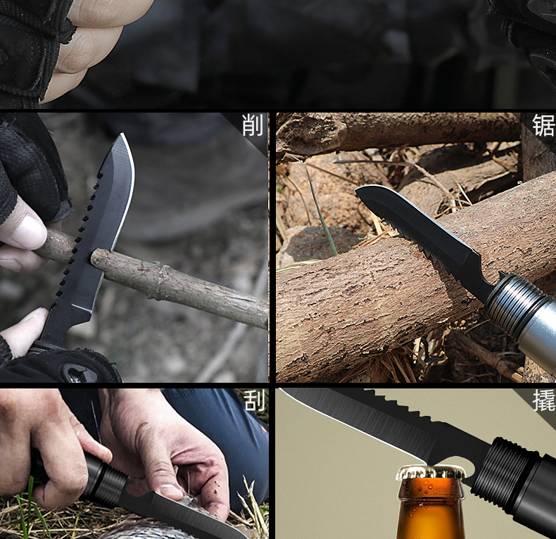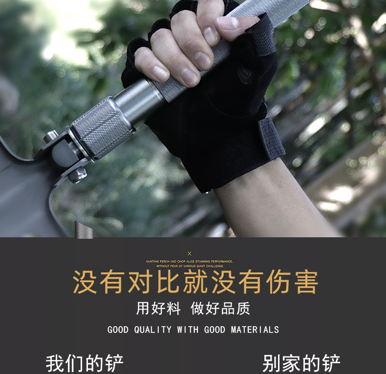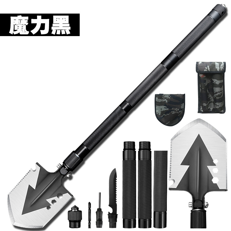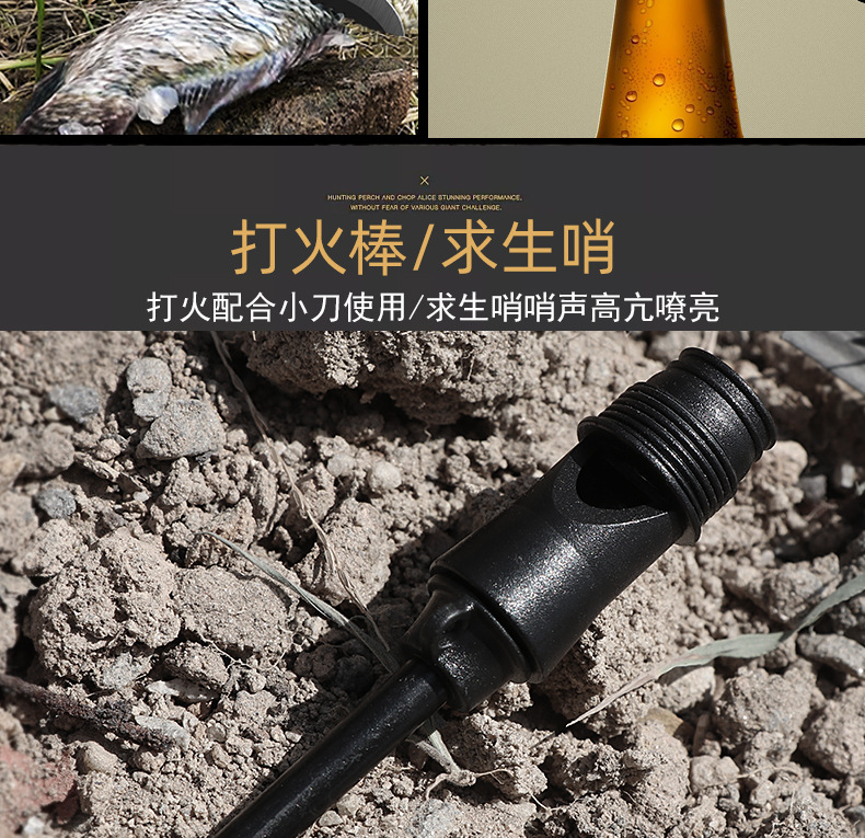 功能介绍:铲 刨 劈 锯 拍 护 破 撬 切 锄 凿 打火 勾 口哨 防身棍 刺 开瓶器 扳手 割绳