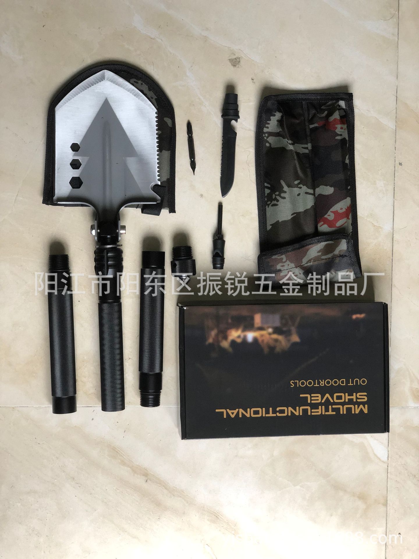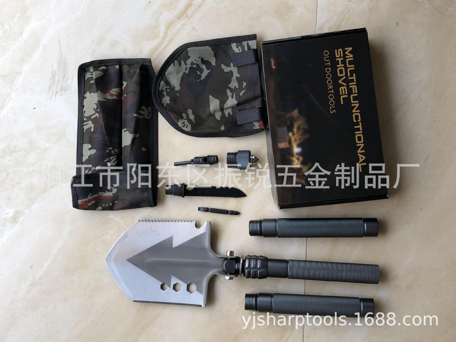 产品清单:铲头*1,链接杆*1,加长杆*2,铲头迷彩包*1,手柄迷彩包*1,战术刀*1,口哨打火石*1,攻击锥*1,十字/一批螺丝刀*1,英文彩盒*1