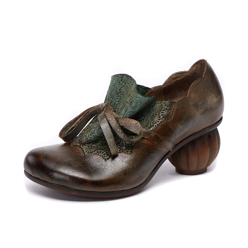 트렌디 한 에스닉 스타일 탑 레이어 소가죽 여성 신발 복고풍 두꺼운 단독 하이힐 두꺼운 굽 예술적 단일 신발 라운드 발가락 통기성 발목 부츠