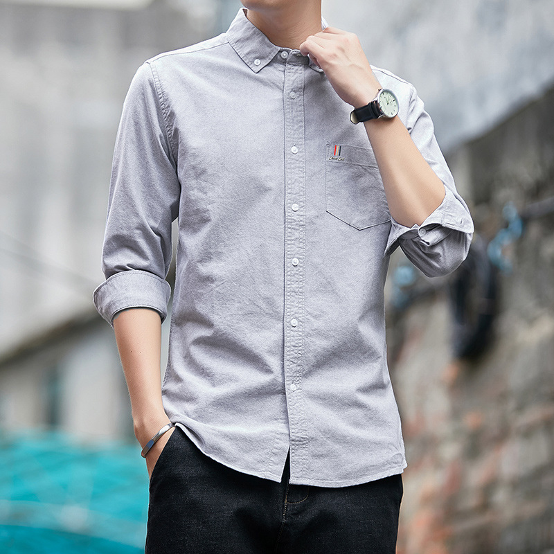 무투유 가을 새로운 남성용 긴팔 셔츠 한국식 슬림핏 캐주얼 솔리드 컬러 포켓 면 옥스포드 스피닝 셔츠