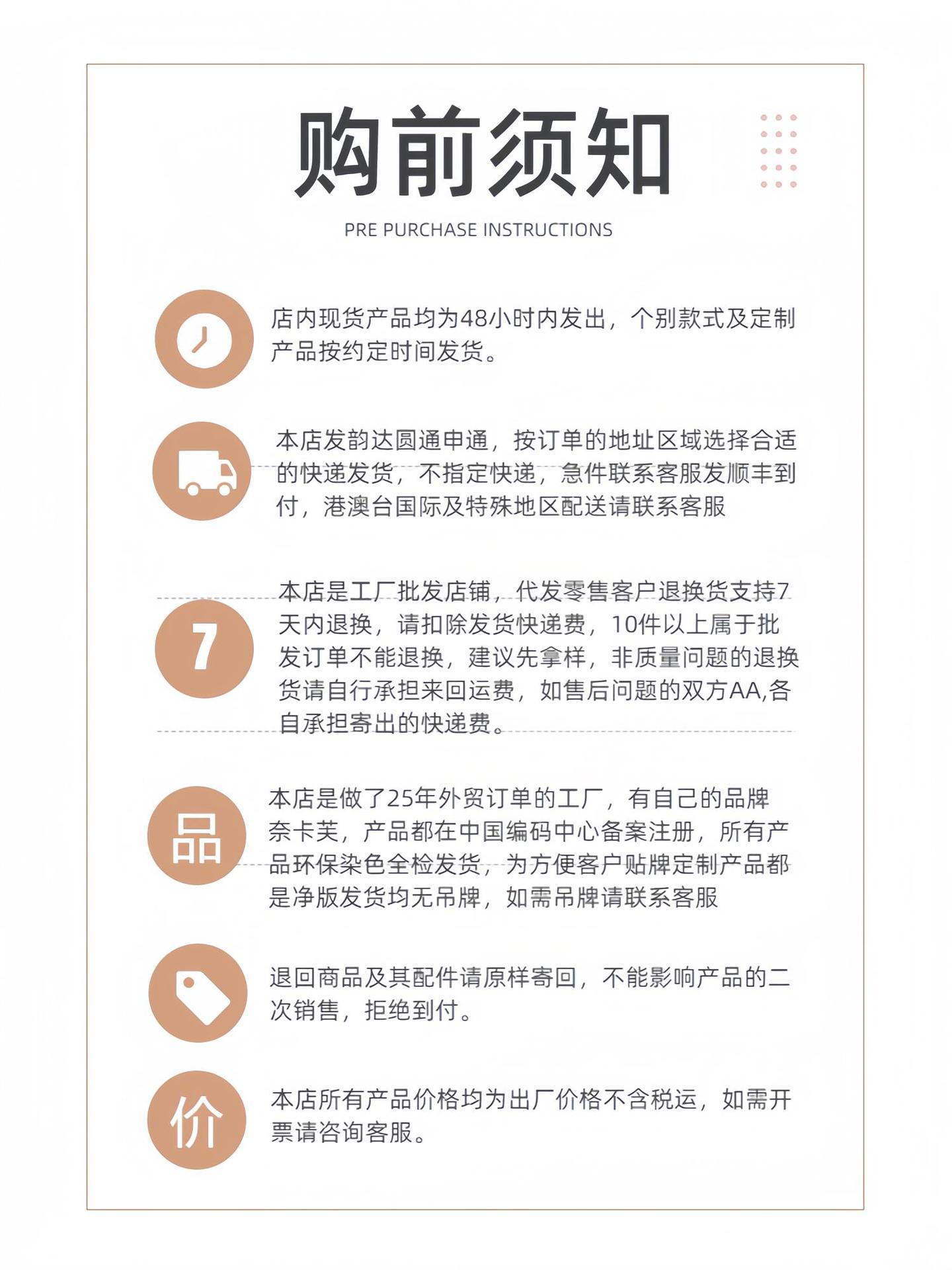 亲!针织产品大小误差1-3cm左右都是正常的,不同批次染色的色差也是无法避免的,克重5-10g左右也是正常范围,请不要以此来投诉大小不符颜色不符和克重不符!针织产品是有弹力的拉一下就长就大的,也不是模具裁剪的,不同工人手势做工都有影响的,针织产品和服装布料不一样,布料是没有弹性的,可以用板子裁片的,所以介意的亲请慎拍!产品以收到的实物为准!