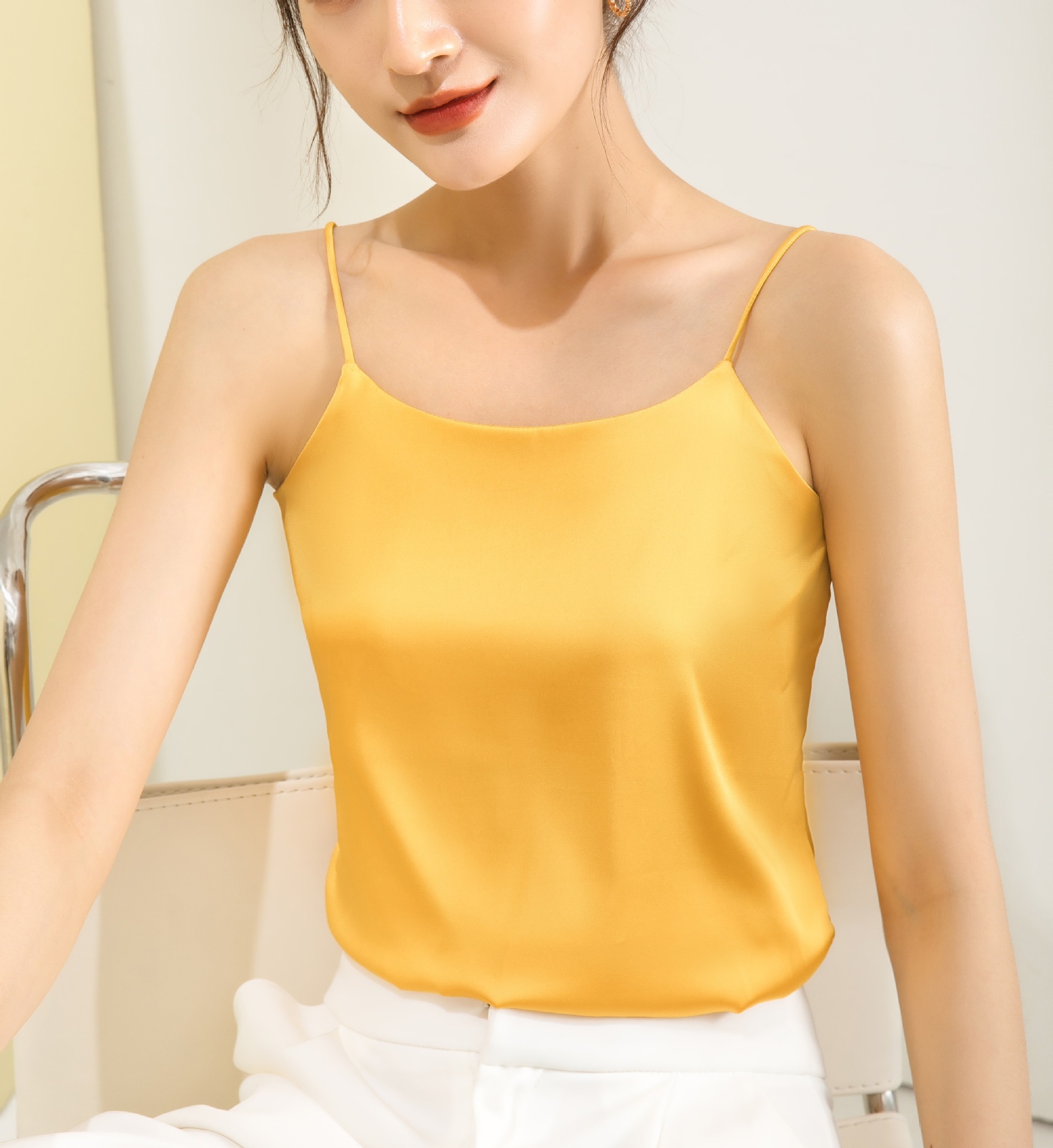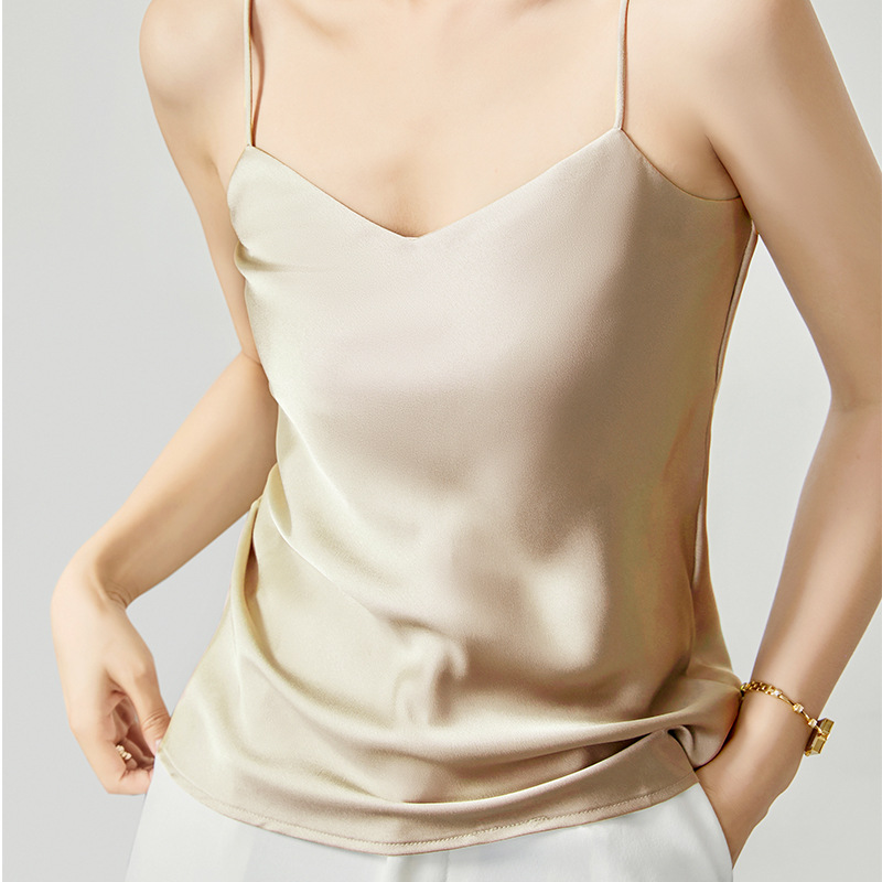 솔리드 컬러 V 넥 섹시한 외부 착용 양면 바닥 상단 여름 내부 착용 인공 실크 아세테이트 새틴 캐미솔 여성용