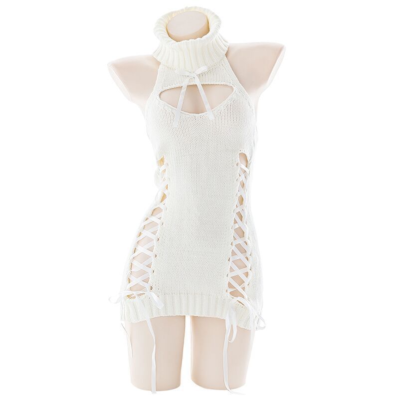 亚马逊速卖通爆款情趣性感开胸露背高领毛衣缎带绑带套装针织衫女