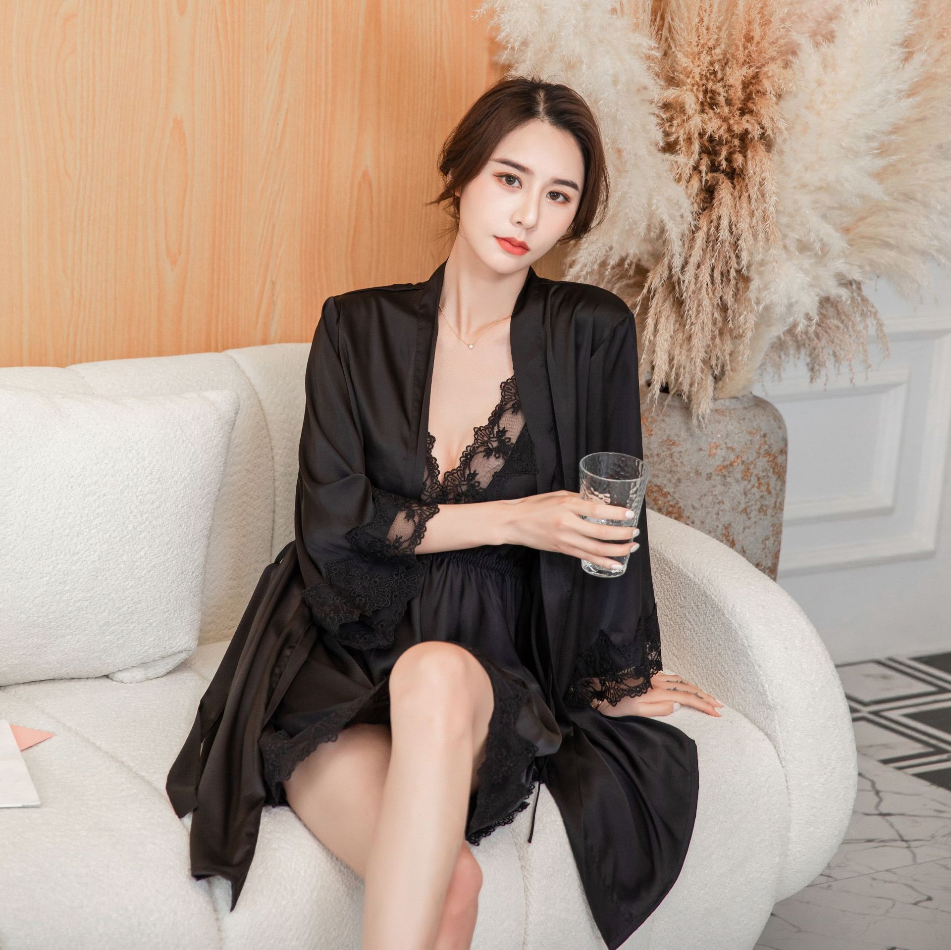 아이스 실크 잠옷 여자의 봄과 가을 얇은 섹시 아이스 실크 슬링 잠옷 투피스 레이스 여름 실크 잠옷 세트스토어 가기