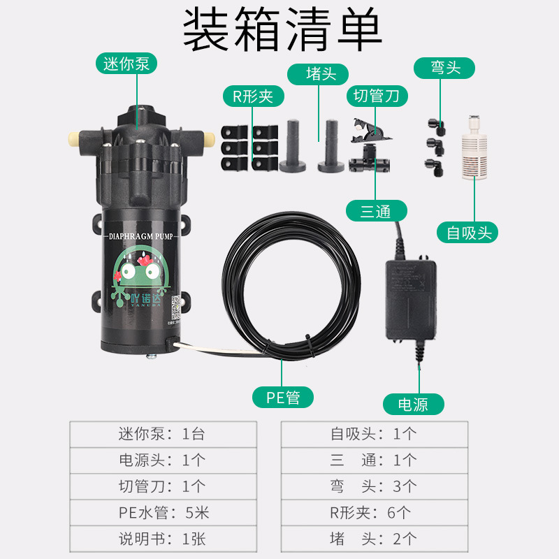 3、第一次使用管子与泵体中都有一定的空气,安装好后,末端喷头的堵头,先不要堵,待泵吸出水后,在堵上,即为排空气完成。
