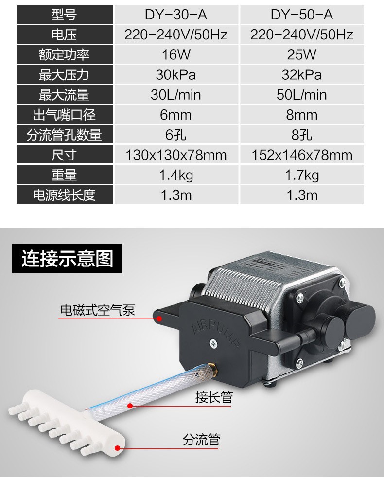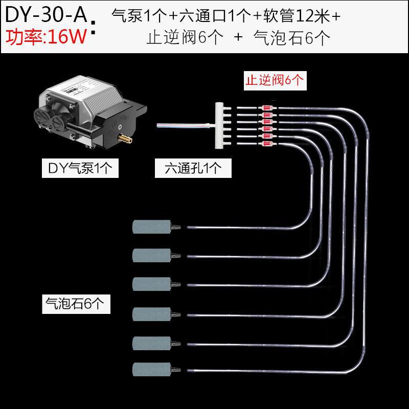 • DY-30A + 12 m 공기 파이프 + 6 체크 밸브 + 6 에어 스톤 + 6 홀 션트 파이프