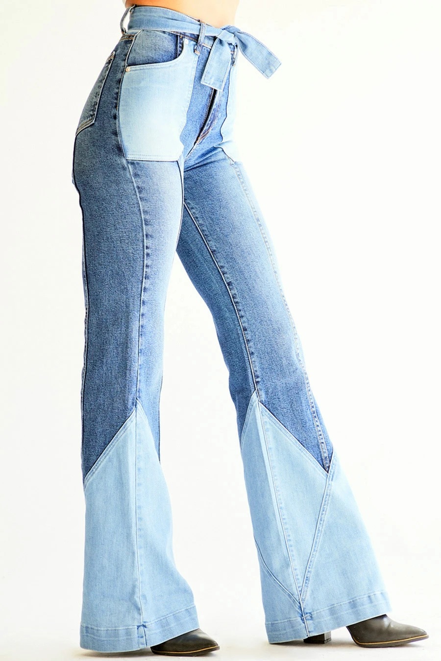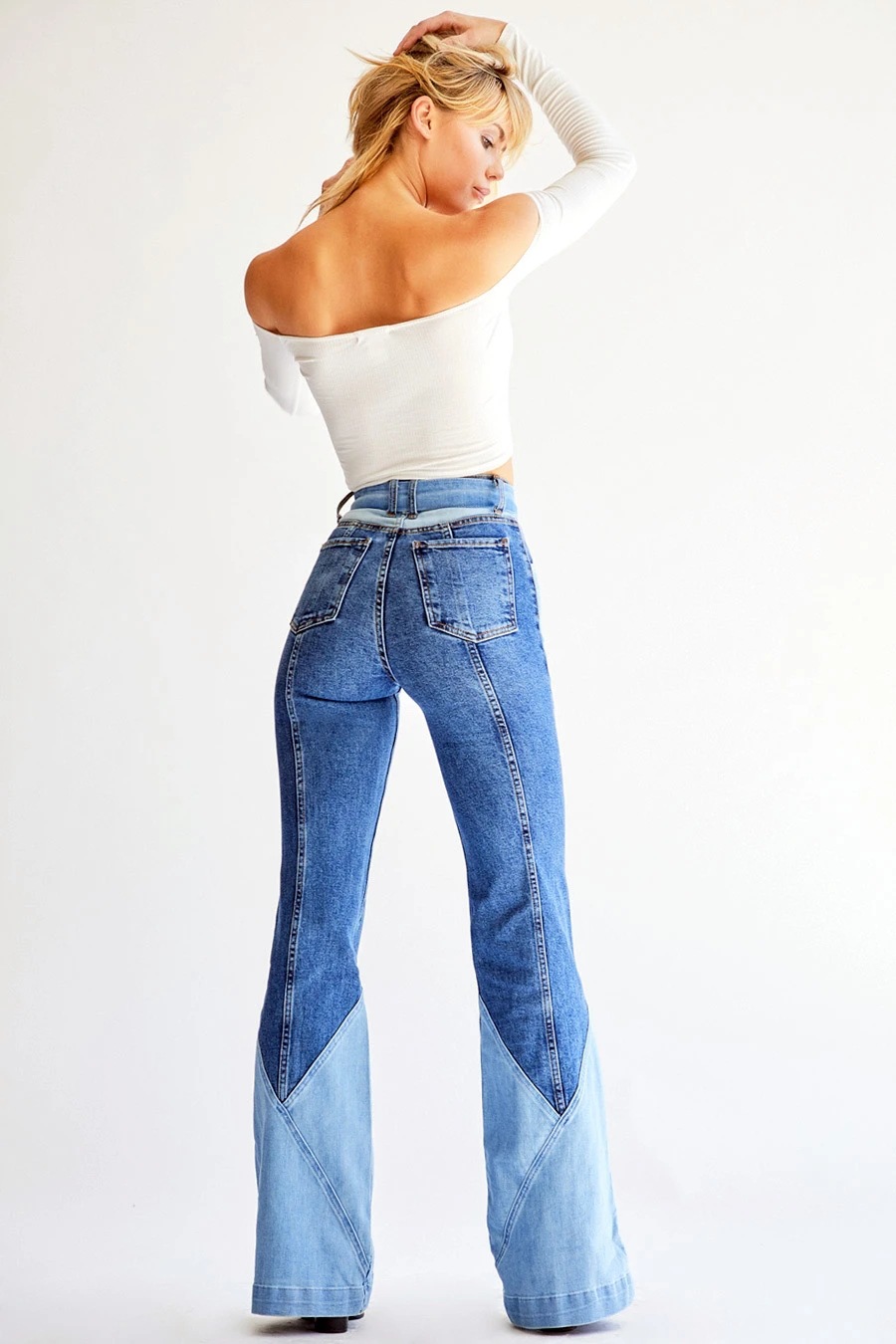 2025 레트로 하이웨이스트 투톤 배색 벨트 고품질 재고 있음 아마존 유럽 및 미국 여성 의류 데님 플레어 팬츠스토어 가기