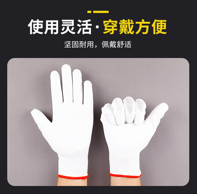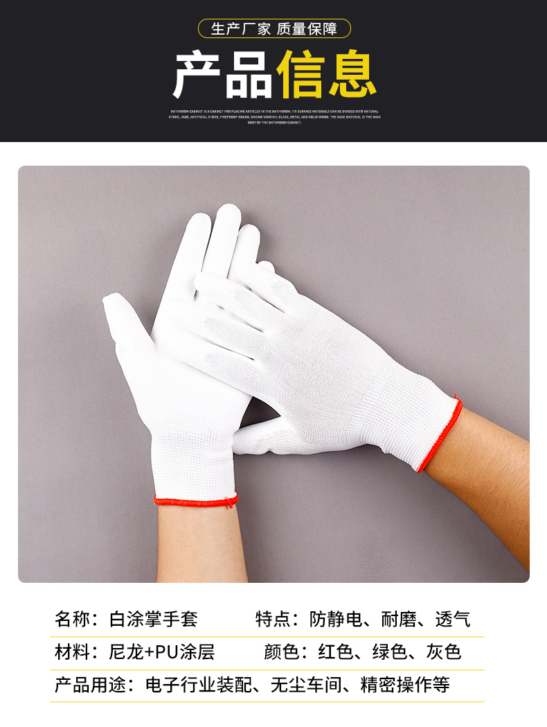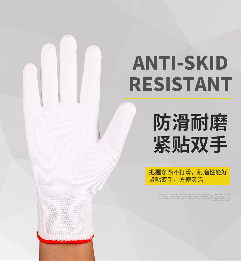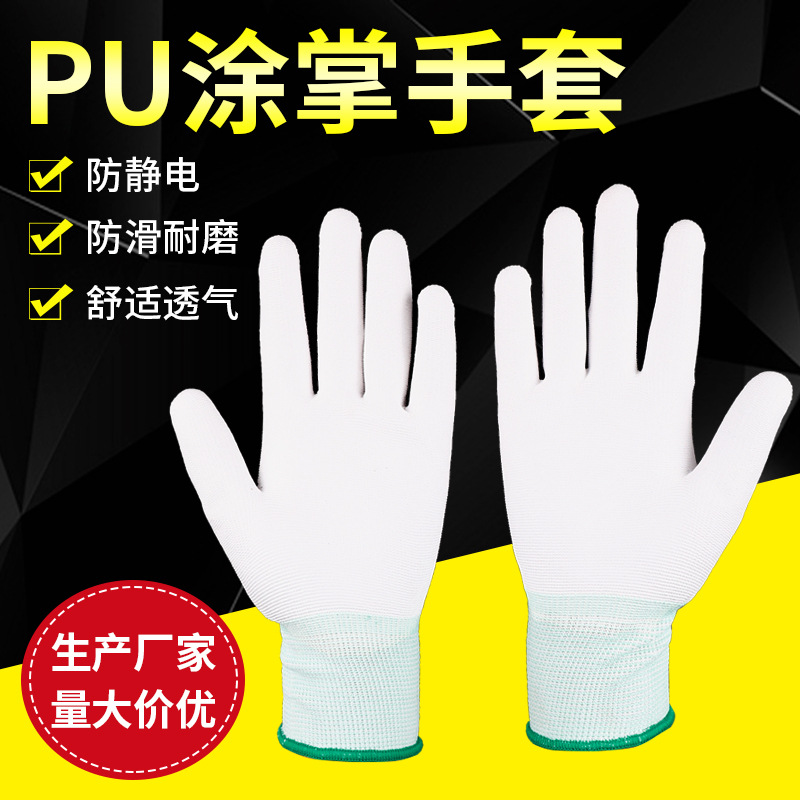PU 팜 코팅 장갑 나일론 13 핀 흰색 정전기 방지 손가락 코팅 미끄럼 방지 장갑 내마모성 미끄럼 방지 접착제 도매스토어 가기