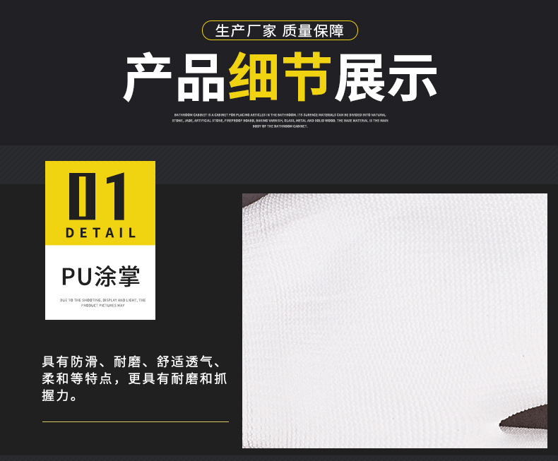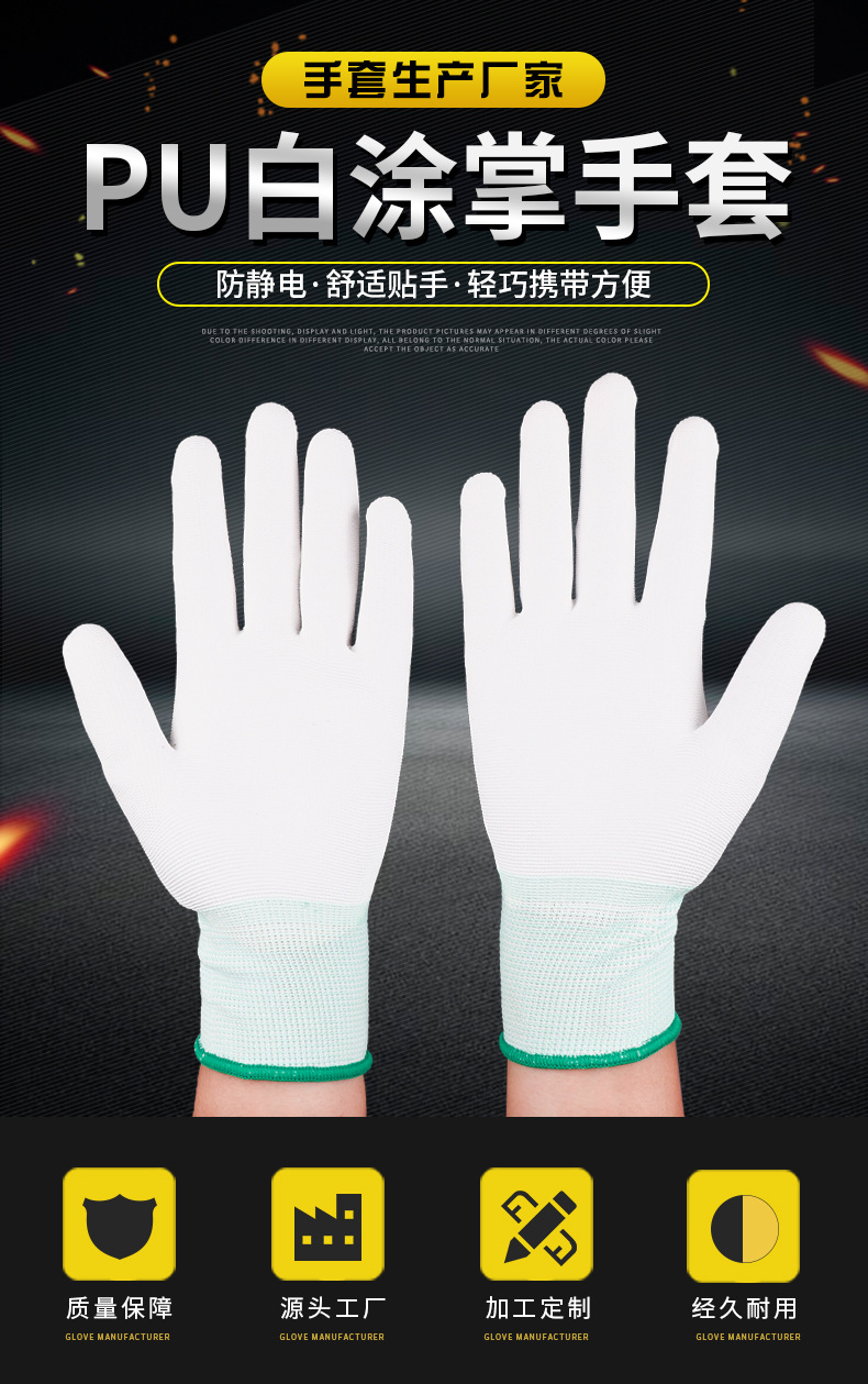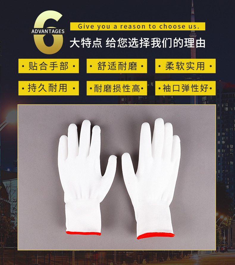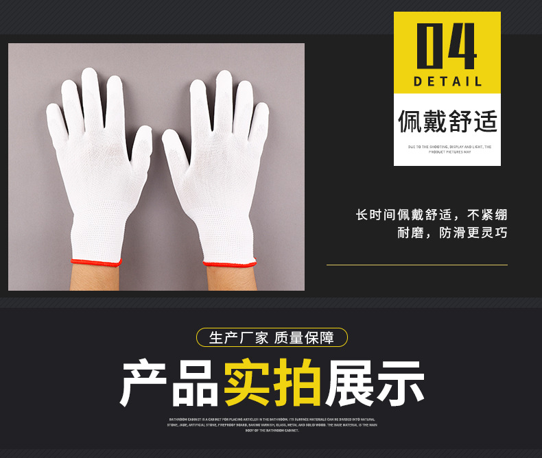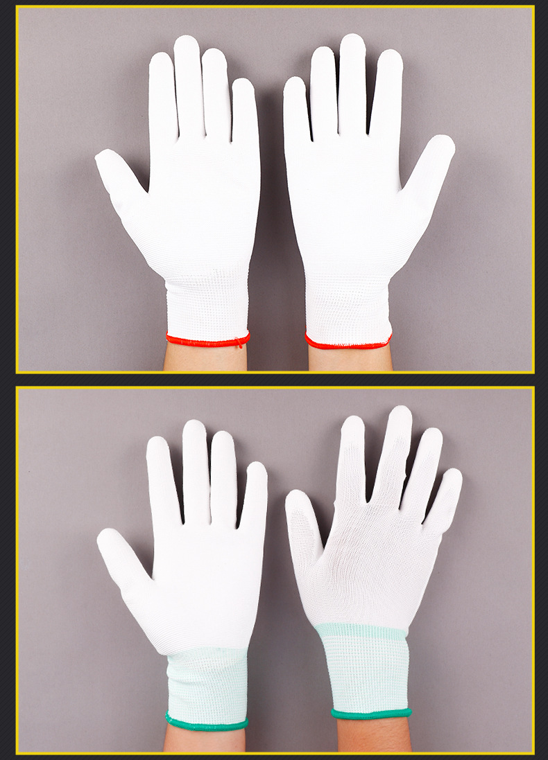 PU 팜 코팅 장갑 나일론 13 핀 흰색 정전기 방지 손가락 코팅 미끄럼 방지 장갑 내마모성 미끄럼 방지 접착제 도매스토어 가기