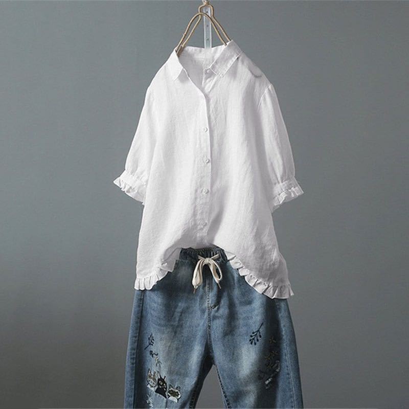 2020 년 여름 여성을위한 새로운 캐주얼 싱글 브레스트 러플 반팔 셔츠스토어 가기