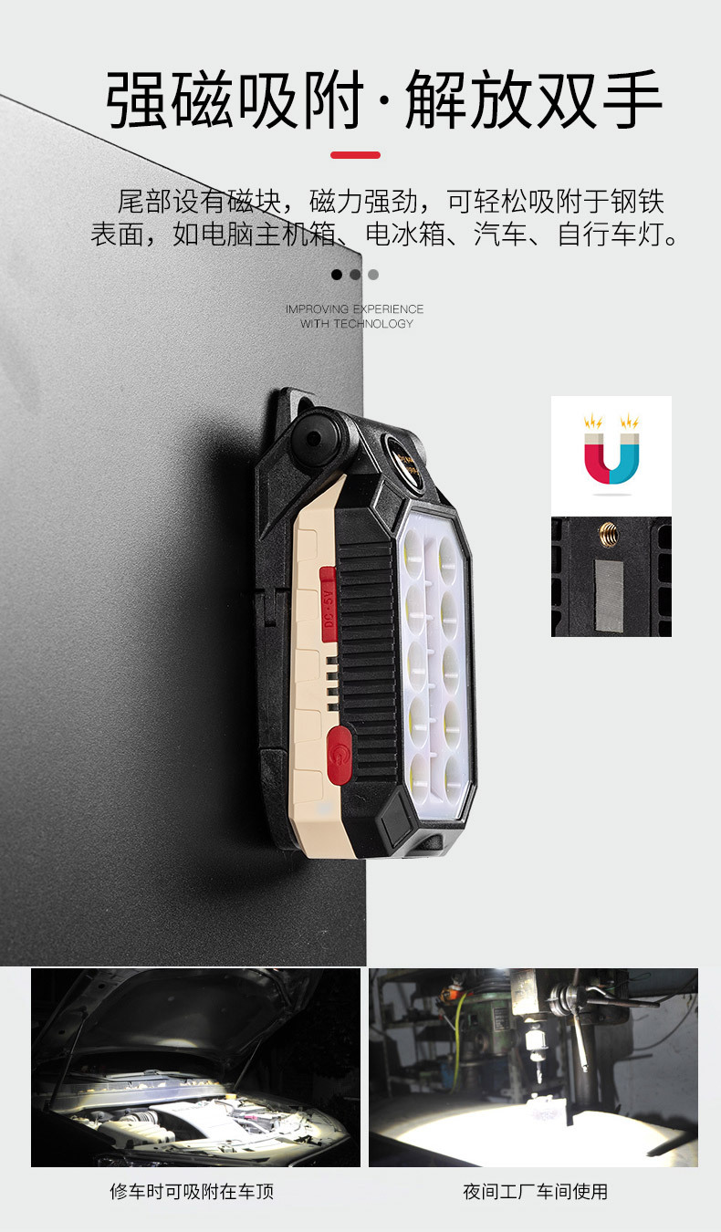 자석이있는 국경 간 새로운 COB 작업등 USB 충전식 LED 후크 전원 디스플레이 비상 손전등 유지 보수 등스토어 가기