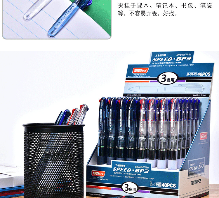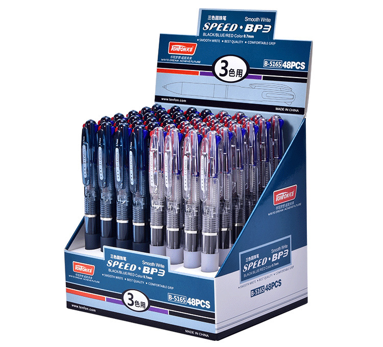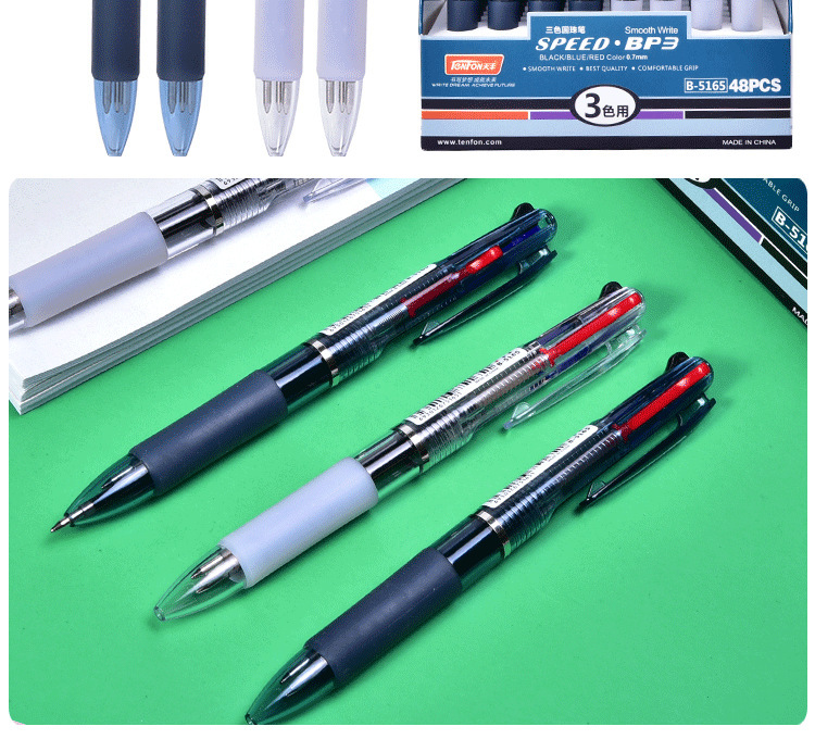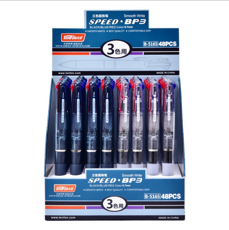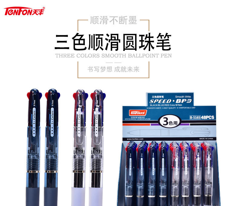 天丰三色圆珠笔 5165透明多色圆珠笔 0.7mm原子笔48支/盒包邮