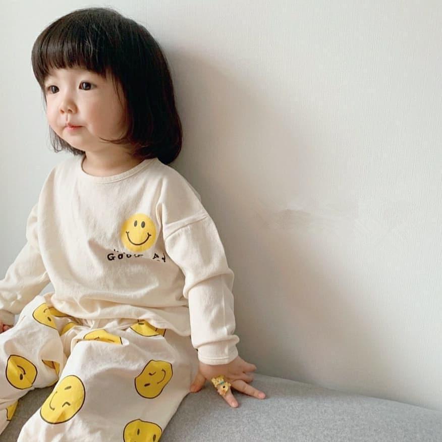 한국식 봄과 가을 소년과 소녀 아기 웃는 얼굴 긴 소매 티셔츠 바지 투피스 세트 아기 느슨한 캐주얼 세트 어린이스토어 가기