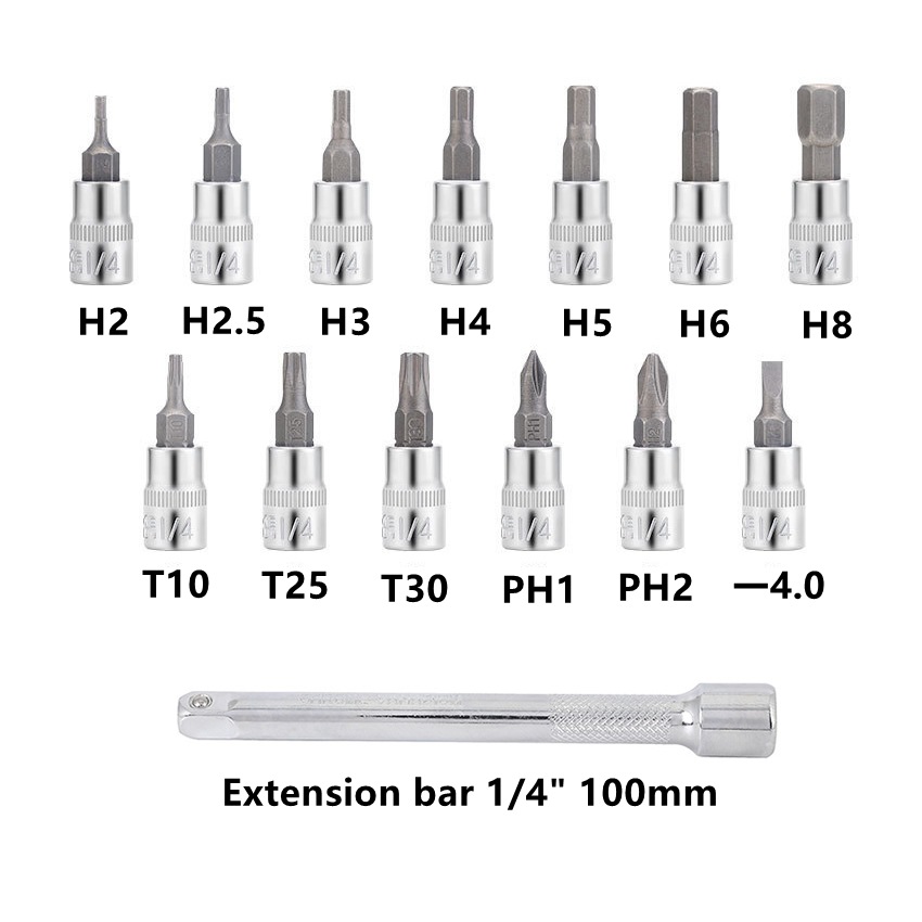 六角花型头:T10、T15、T20、T25、T30;十字PH1,PH2,PH3;一字4mm。加长接杆100mm