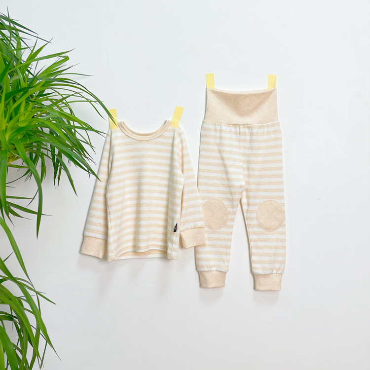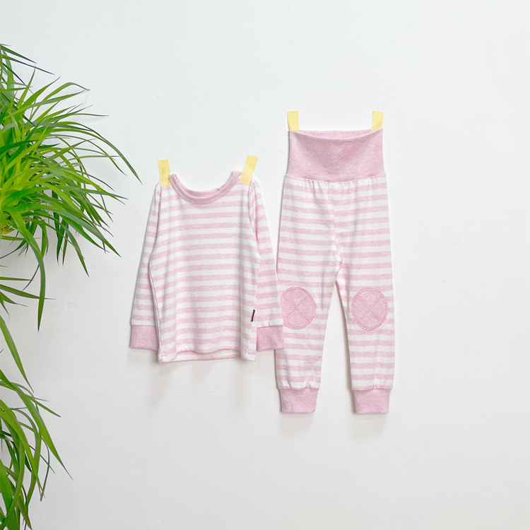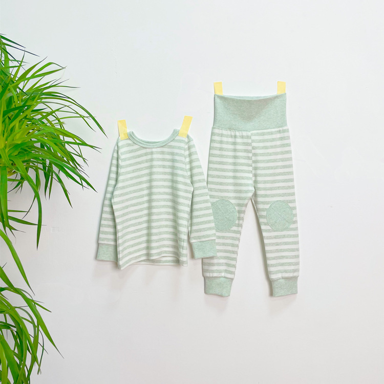 가을과 겨울 가정복 투피스 세트 2023 소년과 소녀 아기 하이 웨이스트 배 보호 속옷 어린이 스트라이프 잠옷 세트