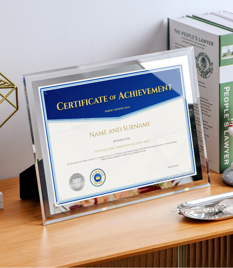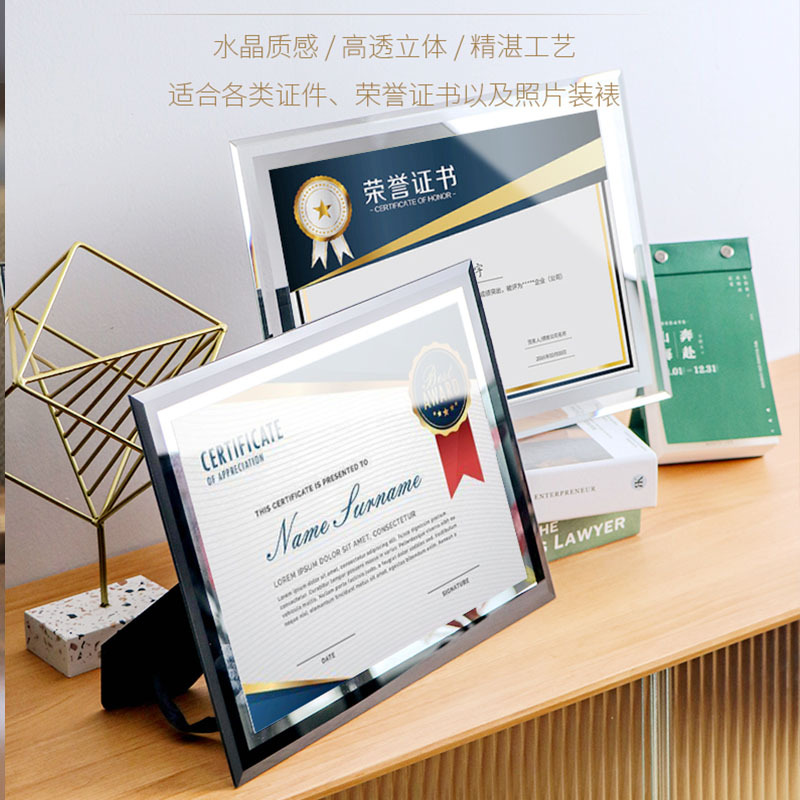 사업 면허액 크리스탈 유리 포토 프레임 도매 테이블 8 인치 7 인치 a4 디스플레이 프레임 인정 영예 증명서 프레임스토어 가기