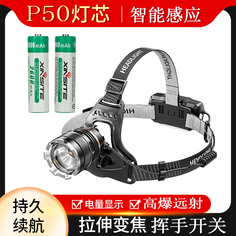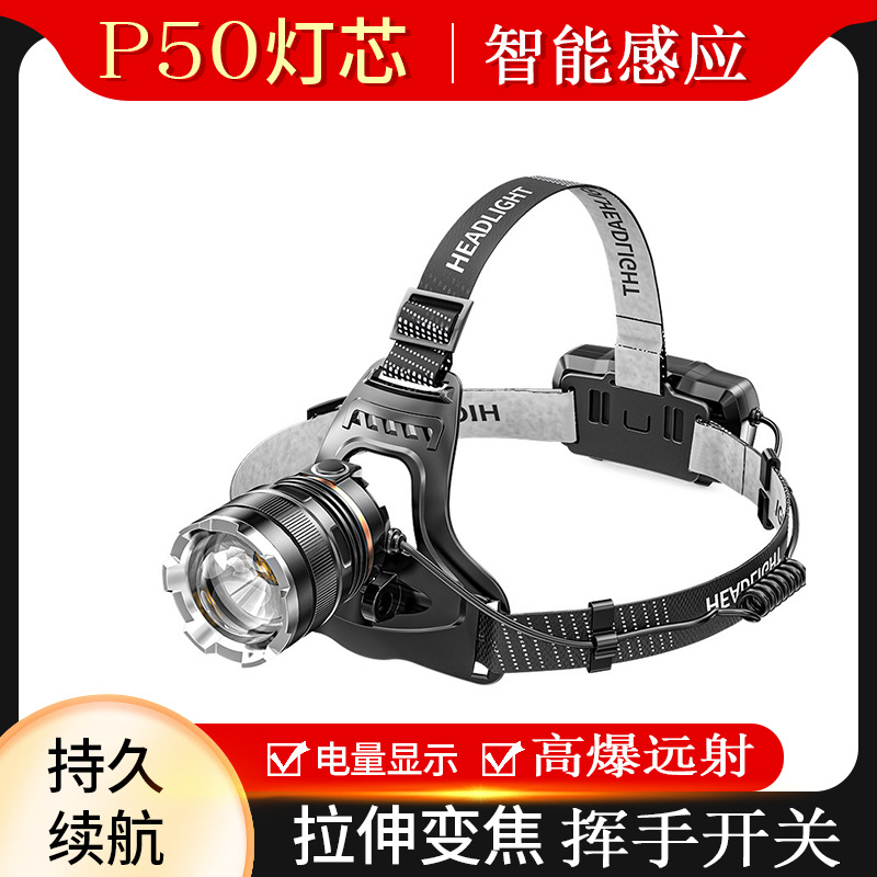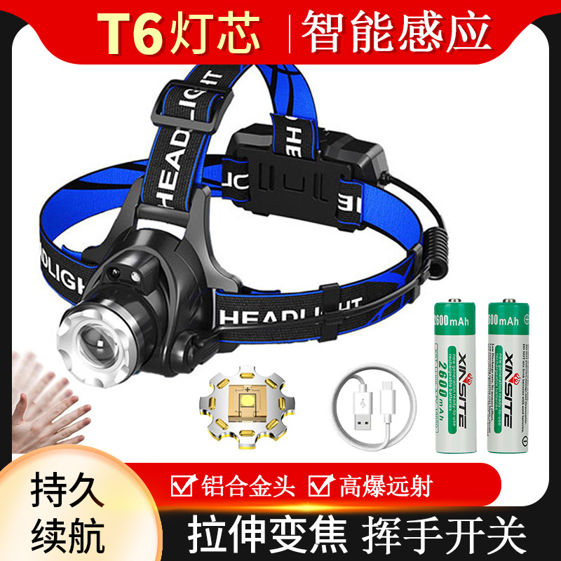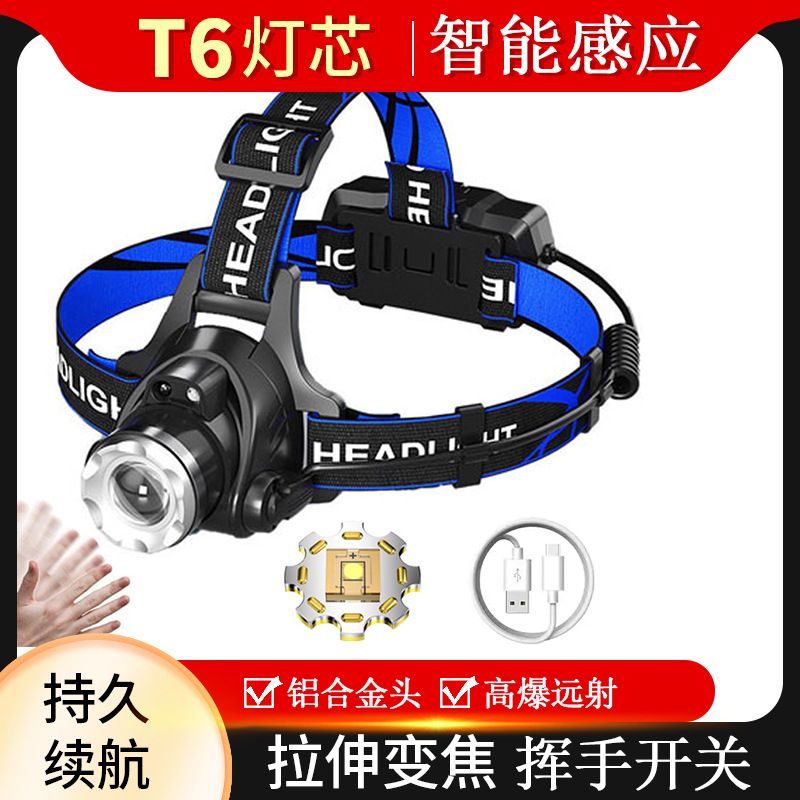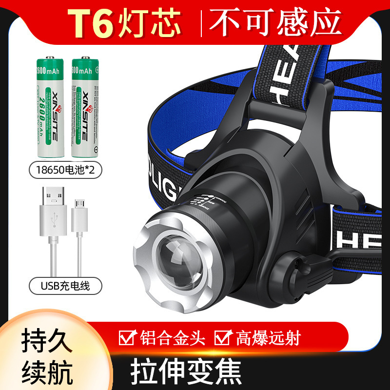 국경 도매 야외 낚시 헤드라이트 방수 T6LED 강한 빛 텔레스코픽 줌 헤드라이트 USB 충전 유도 헤드라이트