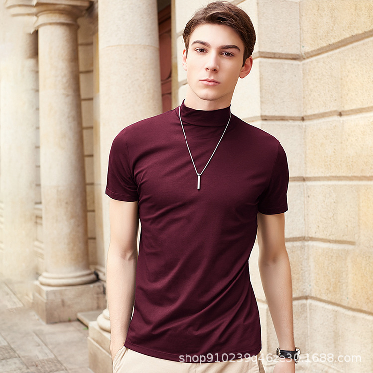 여름 반팔 티셔츠 남성용 머서라이즈 코튼 슬림핏 세미 하이 칼라 솔리드 컬러 베이스 셔츠 모달 반팔 티셔츠 탑