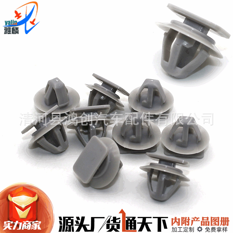 汽车位置用卡扣;汽车顶棚卡扣丰皮铆钉;内饰板卡扣;门饰板卡扣;护板卡扣;底边梁卡扣;座椅卡扣固定卡子;灯扣快丝座子贡螺丝;汽车锁扣;流水条卡扣;后备箱卡扣;叶子板内衬卡扣;机盖隔热板卡扣;隔热棉卡子;密封条卡扣;轮门卡扣;支撑杆卡扣;玻璃托卡扣;玻璃扣;脚垫卡扣;子母扣;双合扣;压条卡扣;保险杠卡扣(前杠 后杠);中网卡扣;机盖扣;穿芯钉;穿心钉;窗帘扣;地板扣;地毯扣;水管卡;油管卡;线卡;德式卡箍;美食喉箍;强力水管卡子;喷水嘴卡扣;压条钉;门提;门保险;开尾销钉;膨胀扣;膨胀螺丝;螺丝扣;膨胀螺丝扣;抽芯钉;胶墩;衬套;金属叶子板螺丝;铁片;螺钉;螺母;铁卡子