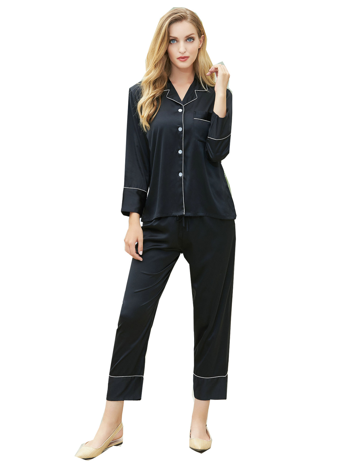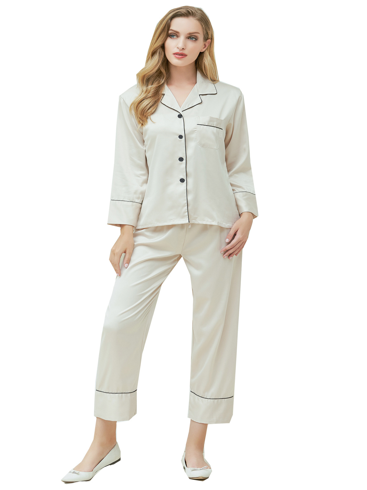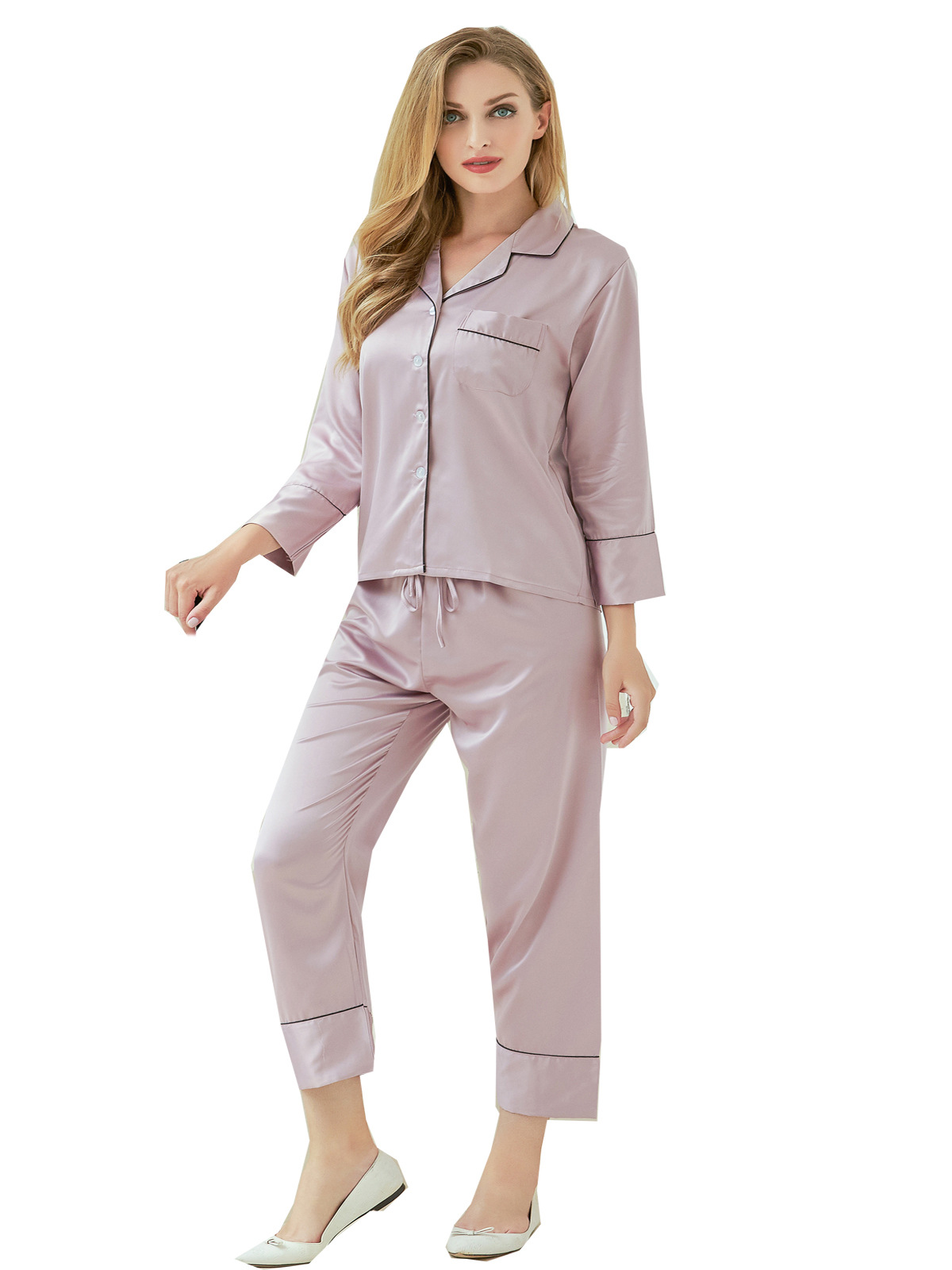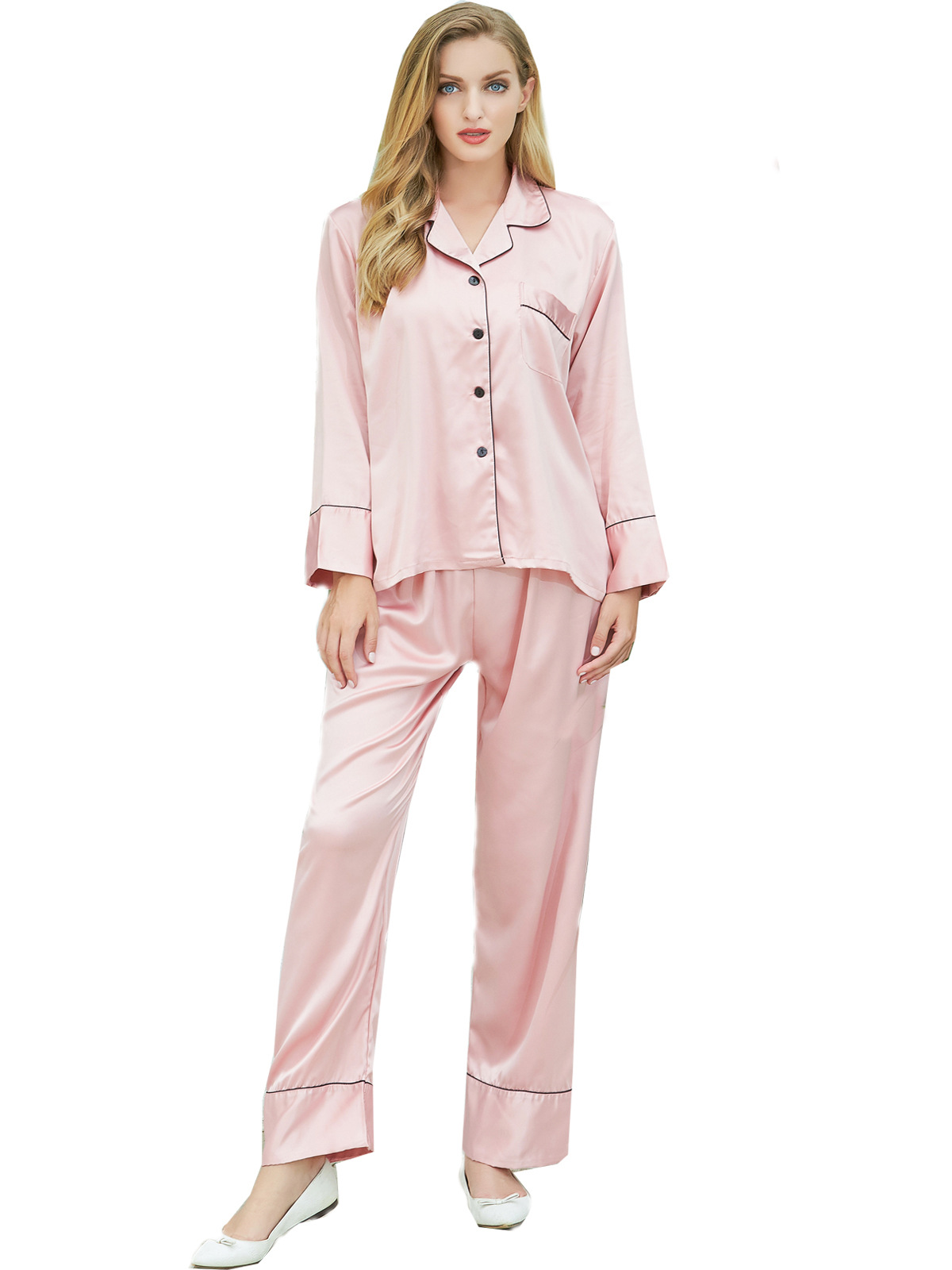 커플의 실크 잠옷 세트 여성의 아이스 실크 여름 섹시한 얇은 긴 소매 봄과 가을 실크 홈 옷 투피스 세트스토어 가기