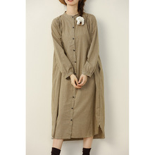 日系甜美大码棉麻碎花连衣裙新款宽松娃娃领系带假两件长袖长裙