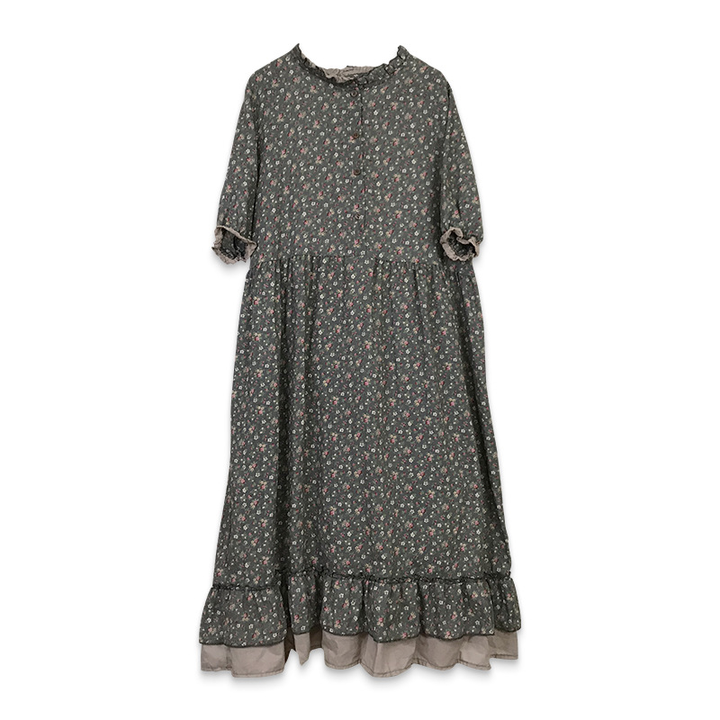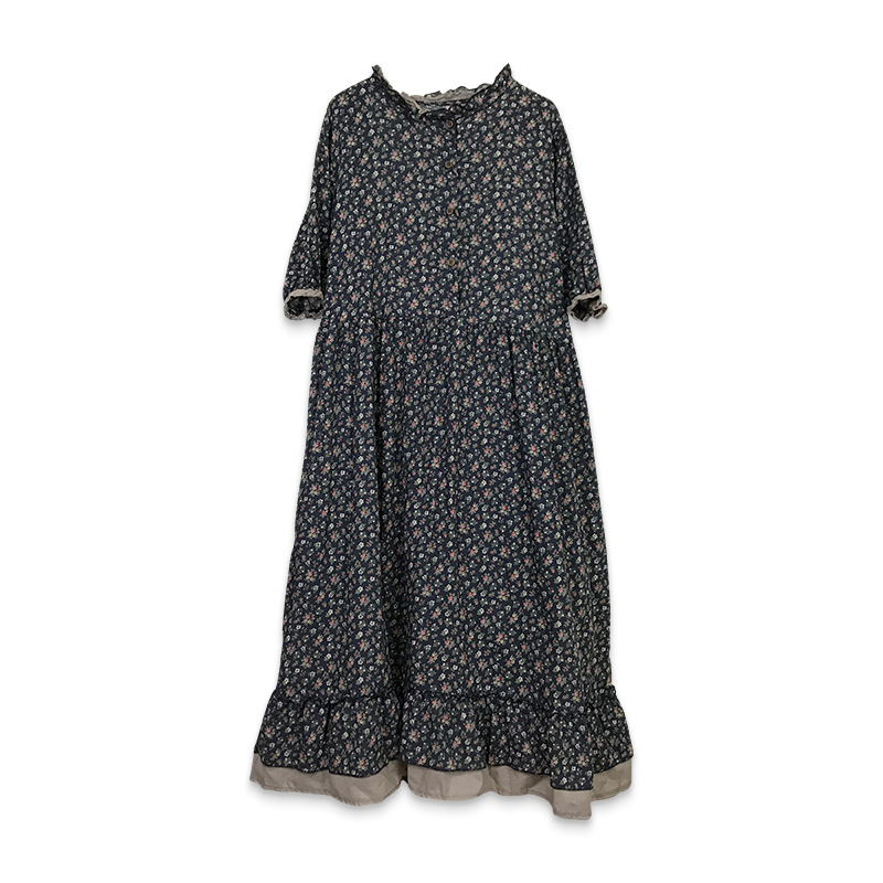 秋季新款森女甜美清新碎花长裙宽松休闲娃娃领拼接棉麻连衣裙时尚