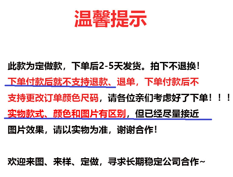 定制时间2-4天。下单后 开始生产 。下单后不能更改订单的颜色和尺码.亲们请谨慎下单哟 !!!!