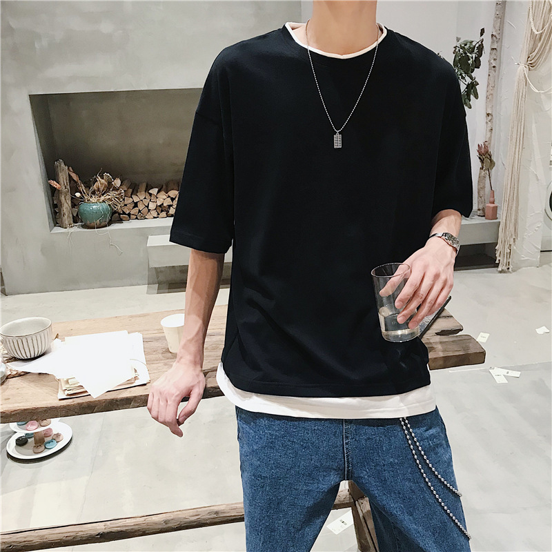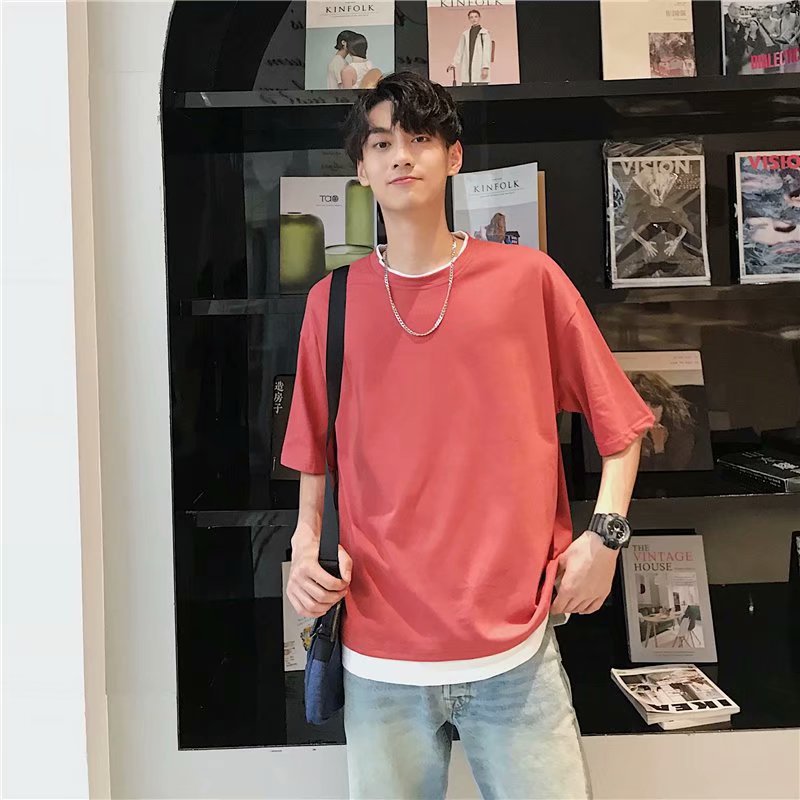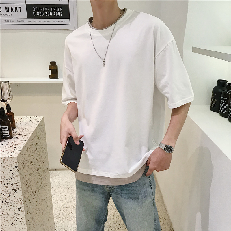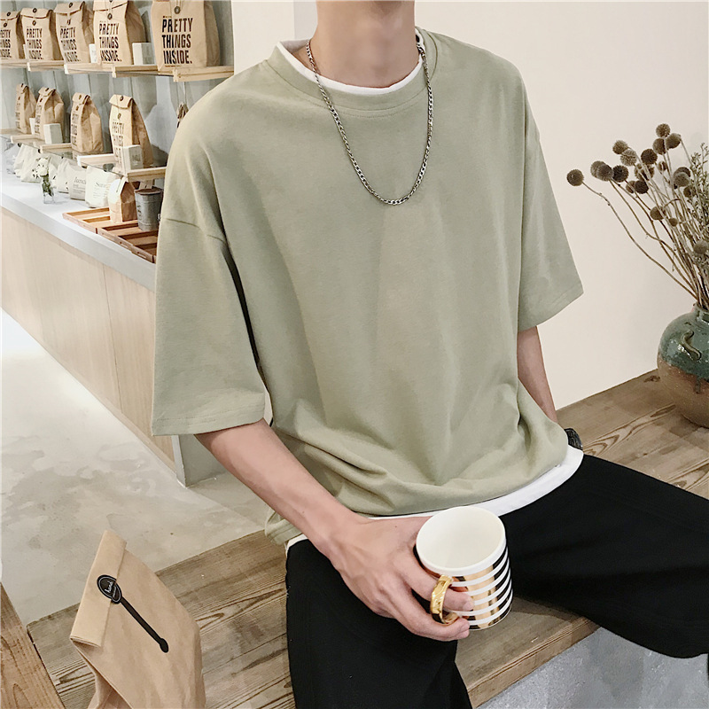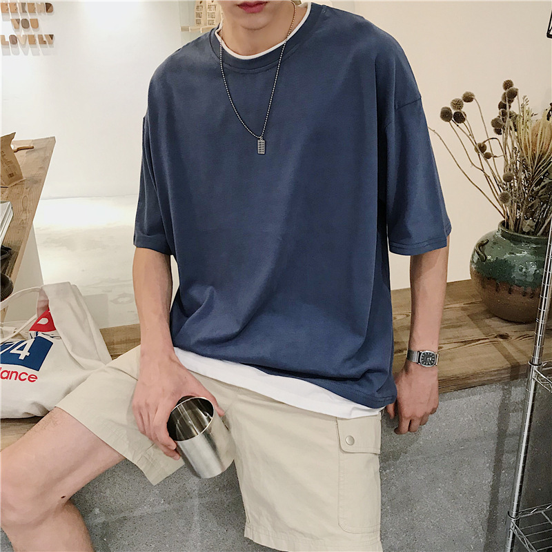국내 트렌드 여름 단색 투피스 스타일 반팔 티셔츠 남성용 루즈핏 반팔 라운드넥 트렌디 학생용 티셔츠 멋짐스토어 가기