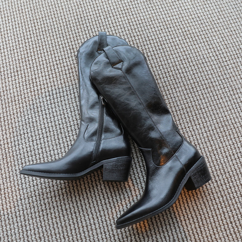 소가죽 두꺼운 뒤꿈치 뾰족한 부츠 여자의 2020 가을과 겨울 새로운 높은 부츠 사이드 지퍼 기모 오래 된 복고풍 서양 부츠스토어 가기
