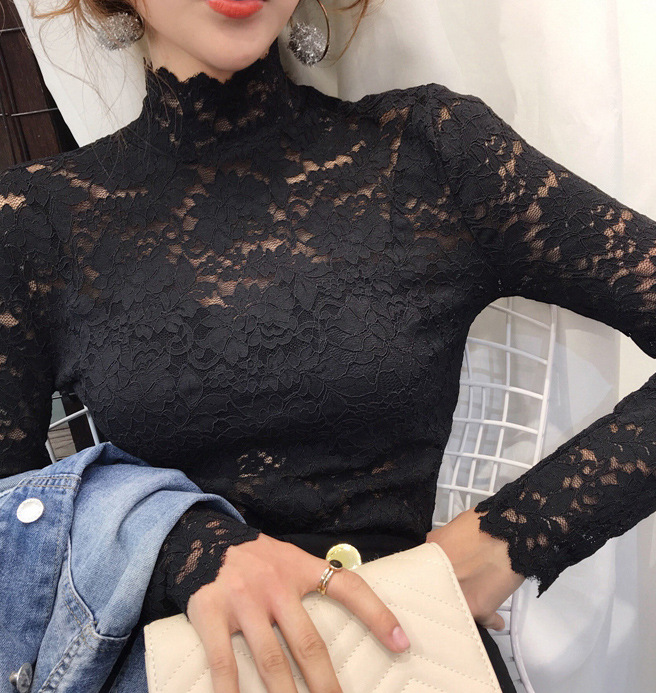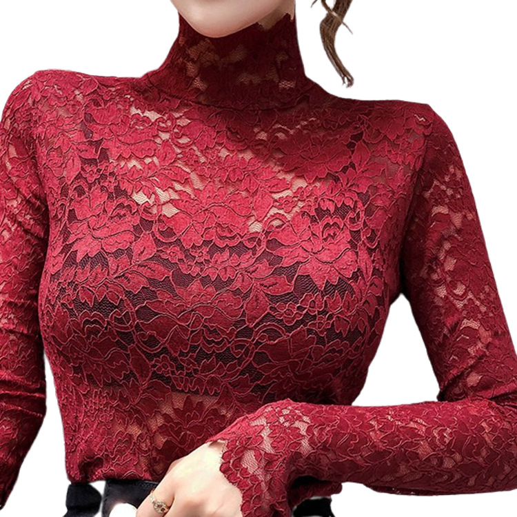 가을과 겨울 새로운 슬림핏 레이스 베이스 셔츠 여성용 긴팔 메쉬 내부 탑 여성용 웨스턴 스타일 스몰 셔츠