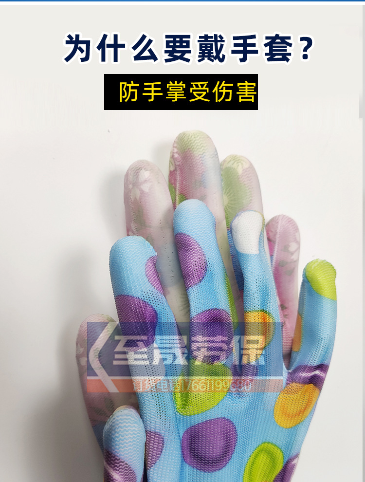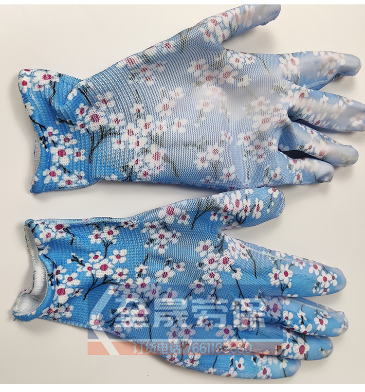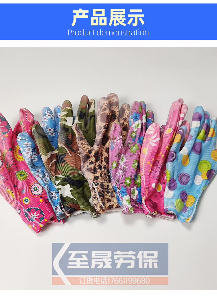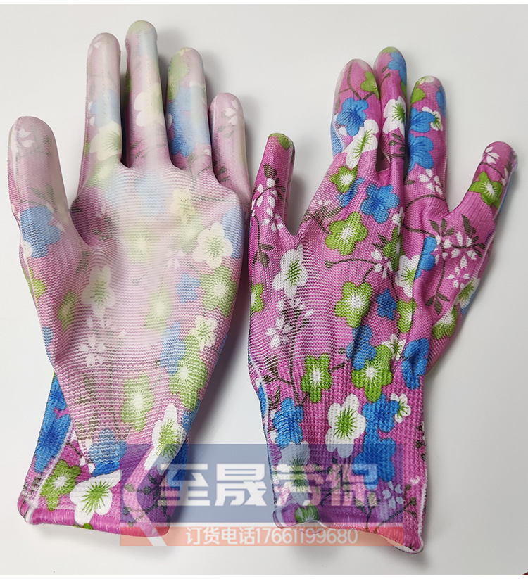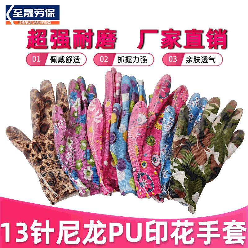 공장 직접 13 핀 나일론 다양한 색상으로 인쇄 된 여성 및 여성용 팜 코팅 장갑 나일론 Pu Palm 코팅 장갑스토어 가기