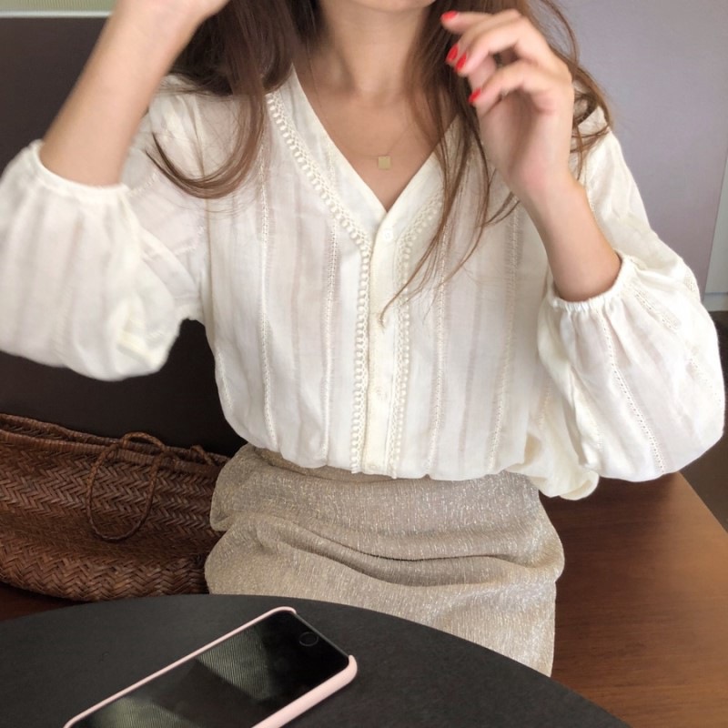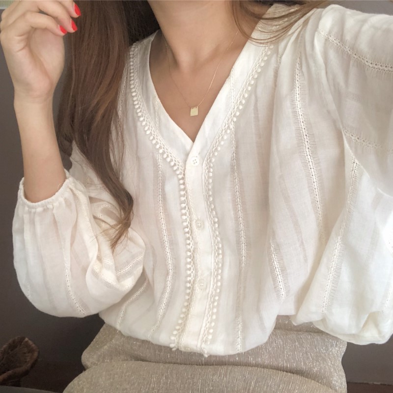 V-넥 퍼프 슬리브 레이스 셔츠 여성용 한국 스타일 흰색 긴 소매 셔츠 2020 이른 가을 셔츠스토어 가기