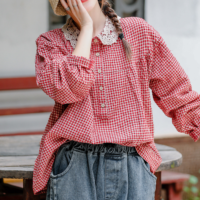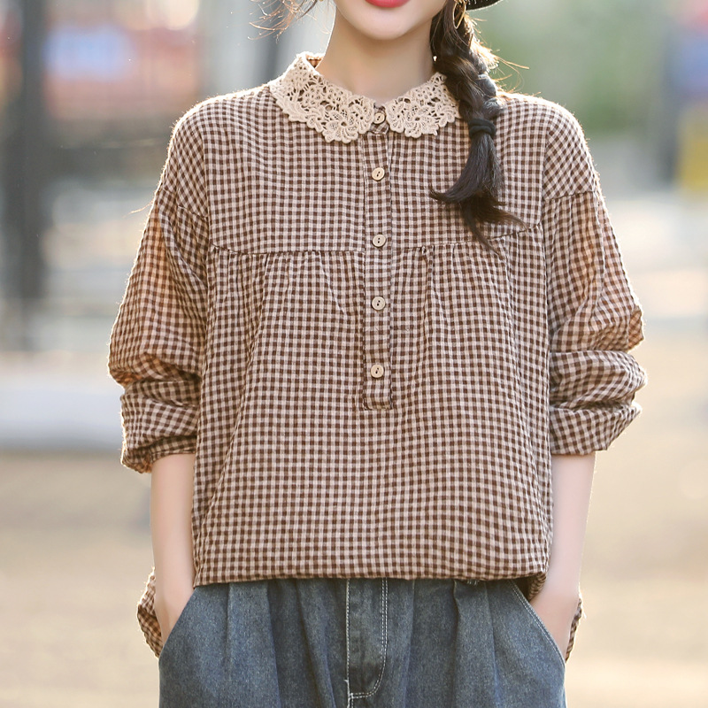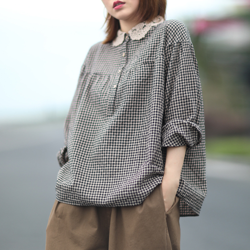 예술적 복고풍 캐주얼 느슨한 플러스 사이즈 레이스 크로 셰 뜨개질 옷깃 스티치 코튼 린넨 격자 무늬 셔츠 여성의 긴 소매 셔츠스토어 가기