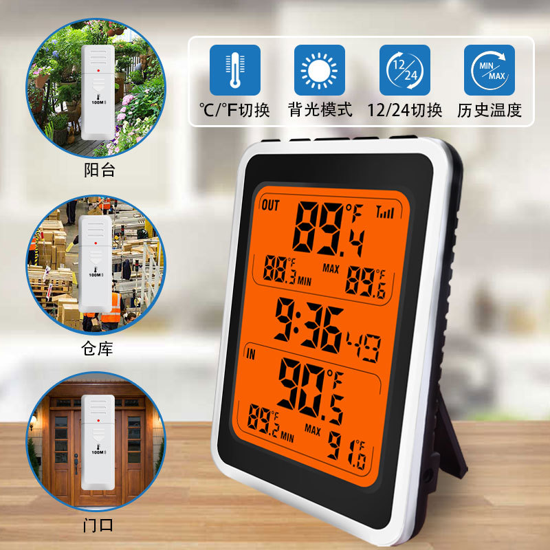 실내 및 실외 무선 온도 및 습도 측정기 오렌지 백라이트 가정용 전자 온도계 제조업체 도매 알람 시계스토어 가기