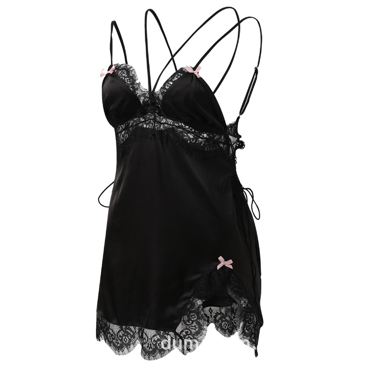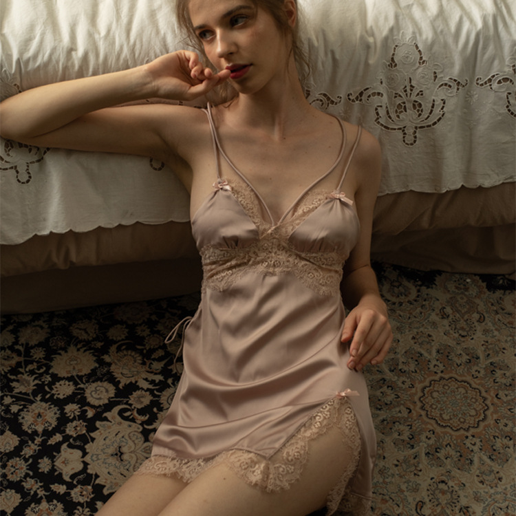 프랑스 스타일 레이스 슬링 나이트가운 순수 섹시 스플릿 새틴 나이트가운 여성용 침대 티어링 모방 아이스 실크 잠옷