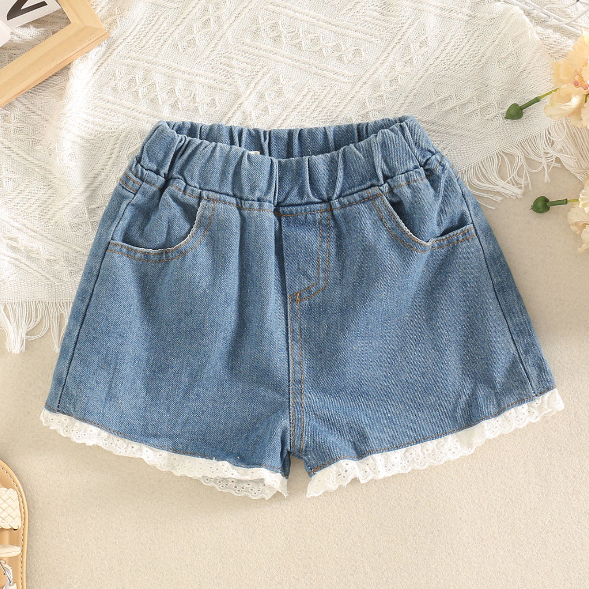 어린이의 달콤하고 편안한 부드러운 데님 반바지 레이스 반바지 5963 여름 새로운 한국어 버전 머리카락의 세대