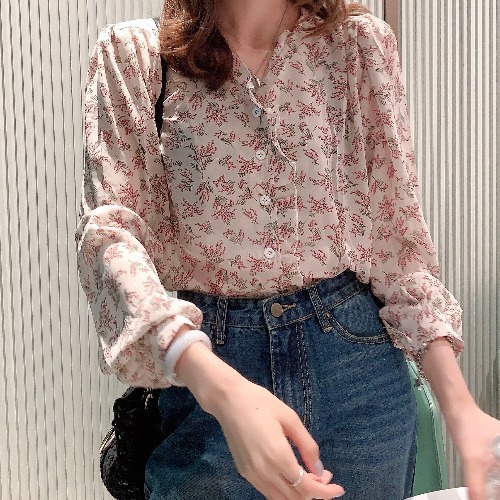 2023 새로운 스타일 작은 셔츠 한국 스타일 서양 스타일 부드러운 스타일 꽃 쉬폰 셔츠 여성용 긴 소매 베이스 셔츠 퍼프 슬리브 탑스토어 가기