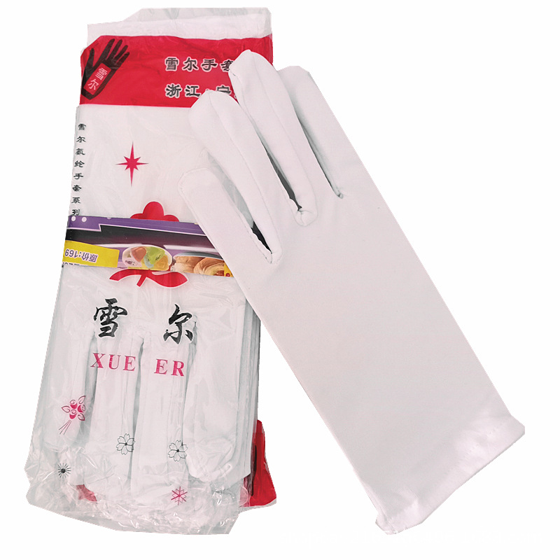 手套材质为氨纶,不是棉,手感顺滑不吸汗,一般用于珠宝,镀膜,学校,广场舞,礼仪,运动会,盘文玩,酒店,服饰配件等。
