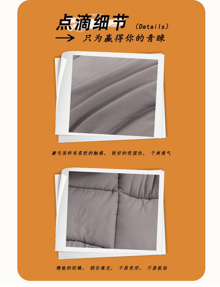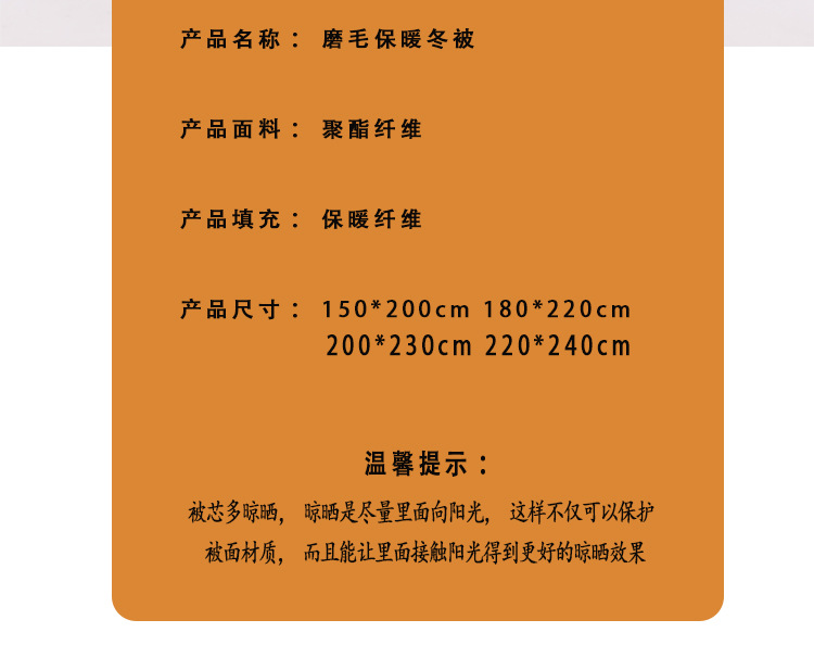 【面料】:磨毛压花纤维(100%聚酯纤维)